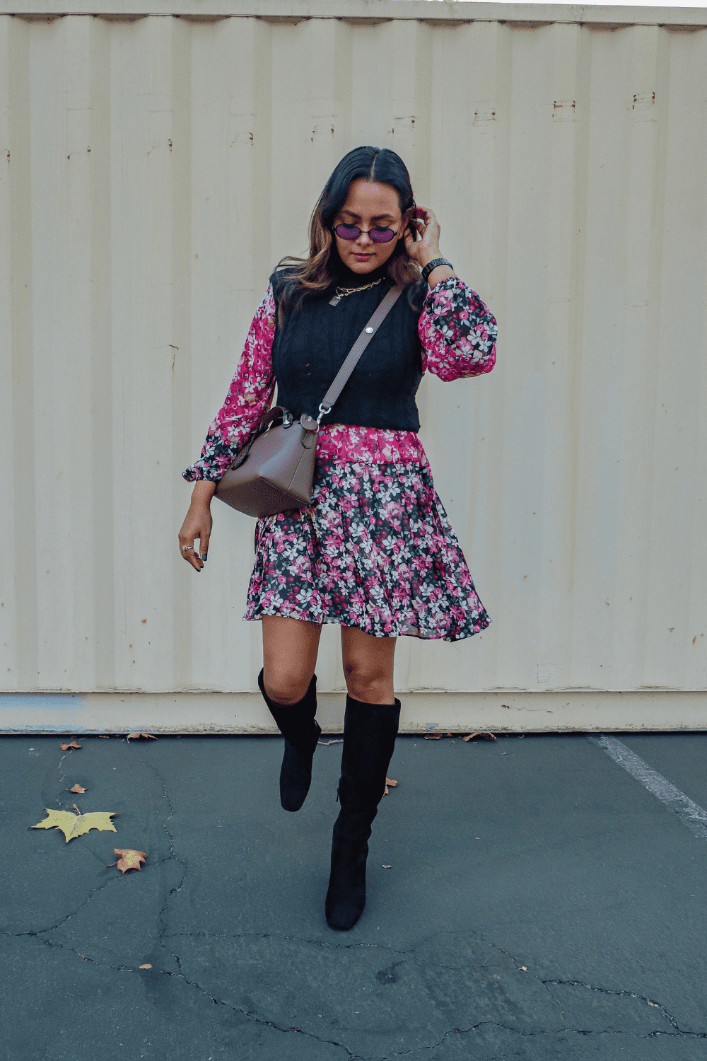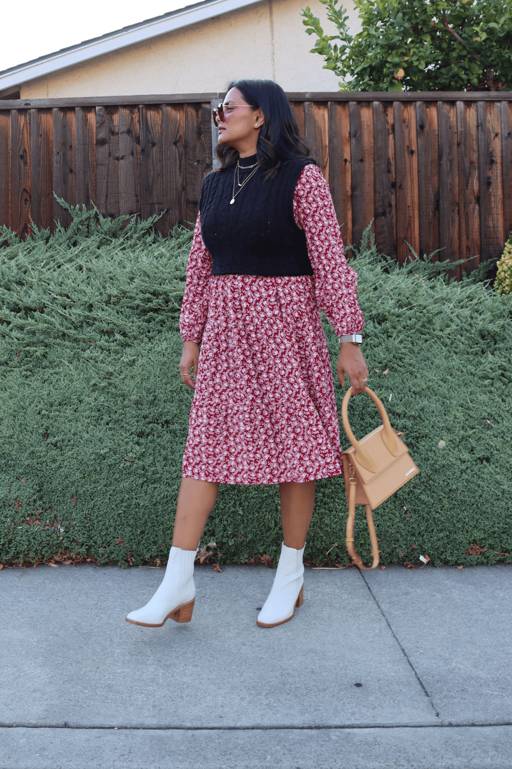 In this look I am wearing a printed mini dress that I absolutely fell in love and wanted to keep on wearing for cooler weather. I simply added a tall boot and a sweater vest that kept ,e cozy when the temperatures dropped.