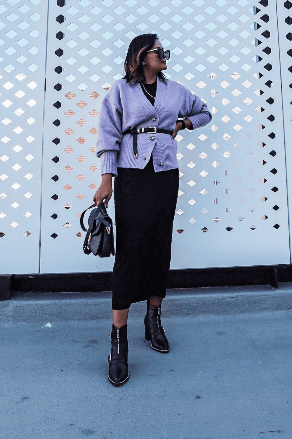 This to me feels like an awesome date night outfit where you can create a monochromatic outfit with similar tones of accessories and layering piece. My only tip is to keep one or two pieces in the whole look to a different color.