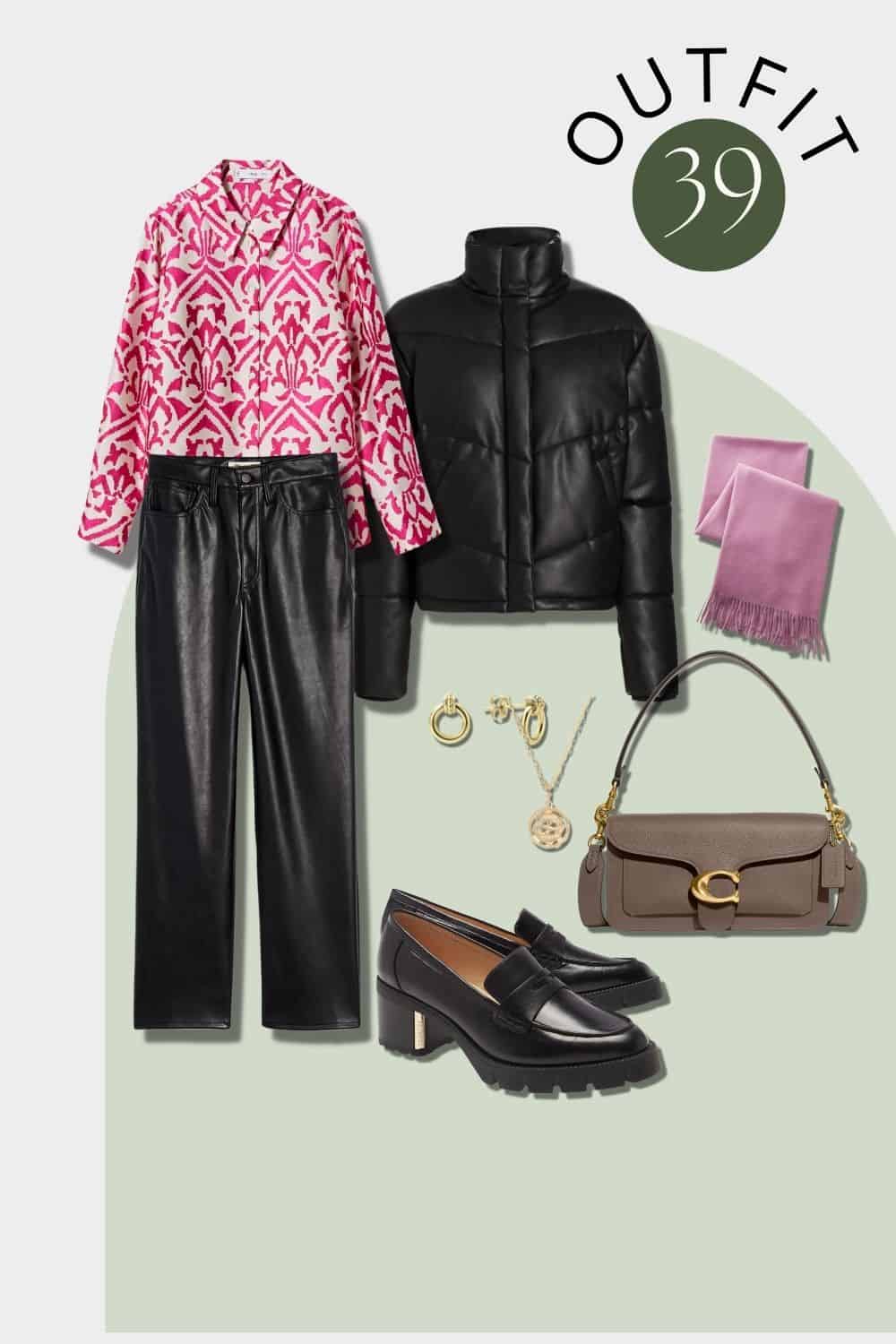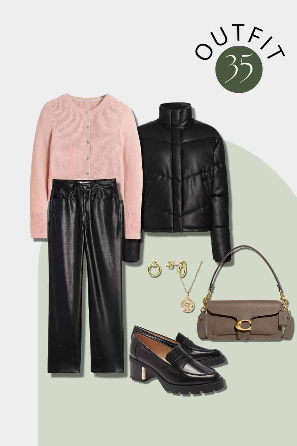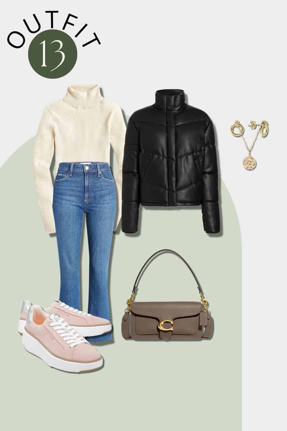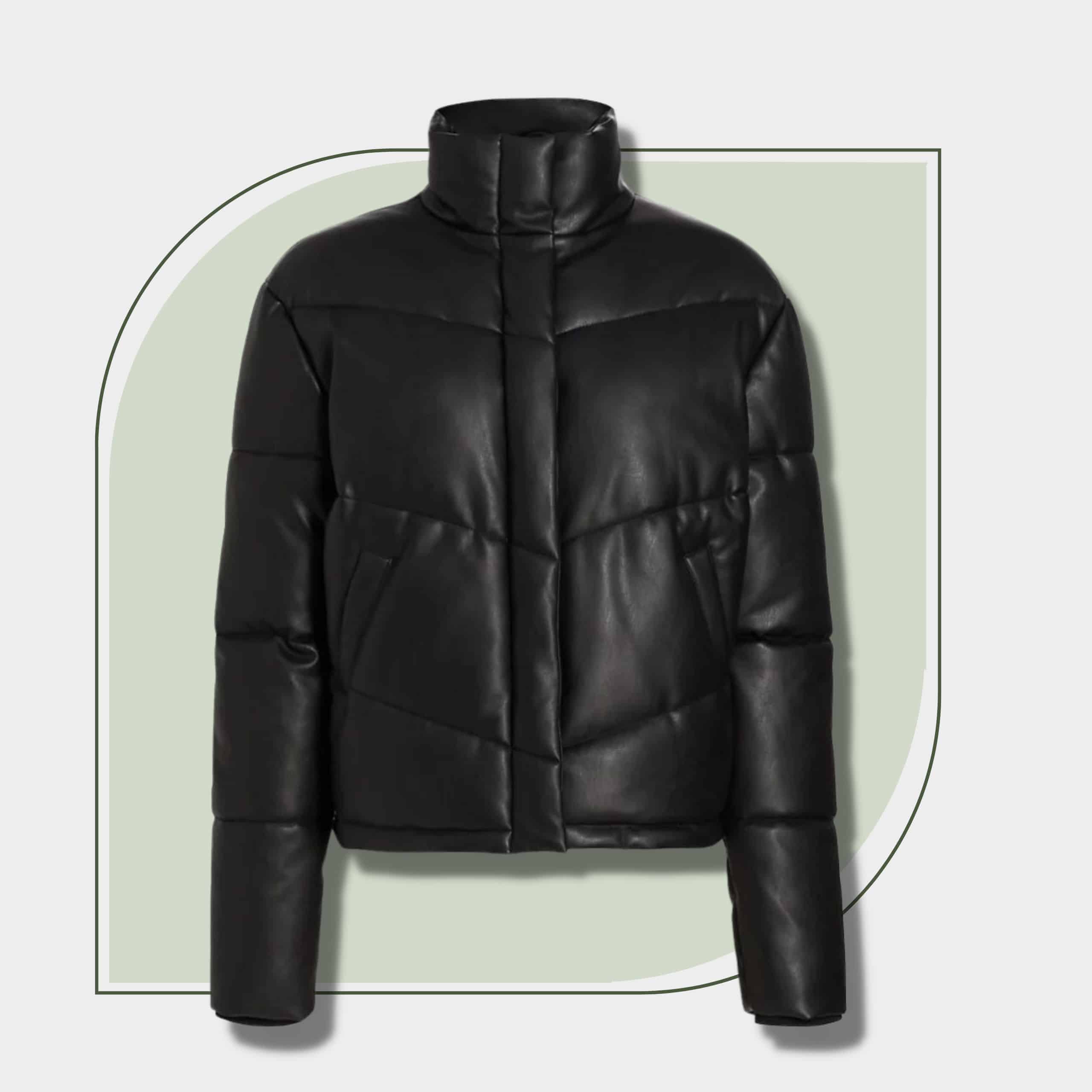 That is why I chose a short faux leather puffer jacket that you can wear not only with jeans, but also with dresses and skirts. And the leather material elevates the clothing item.