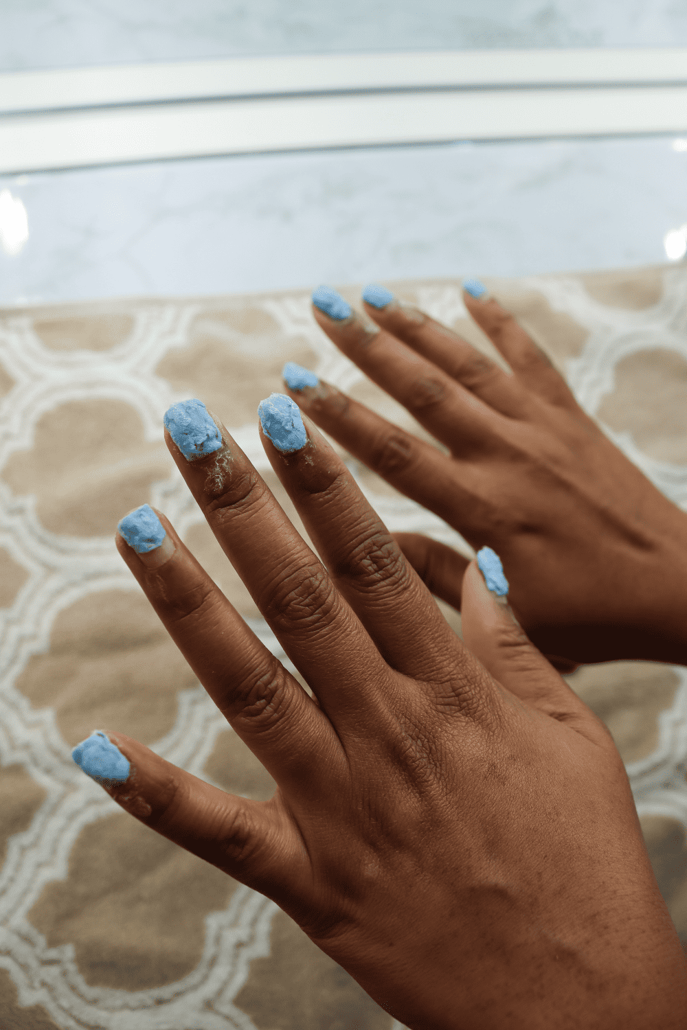 For me it takes about 5-7 minutes again depending on the layers I have applied on my nails. It does look a bit gross, but let it do its thing. The remover paste penetrates your nail polish and lifts it.