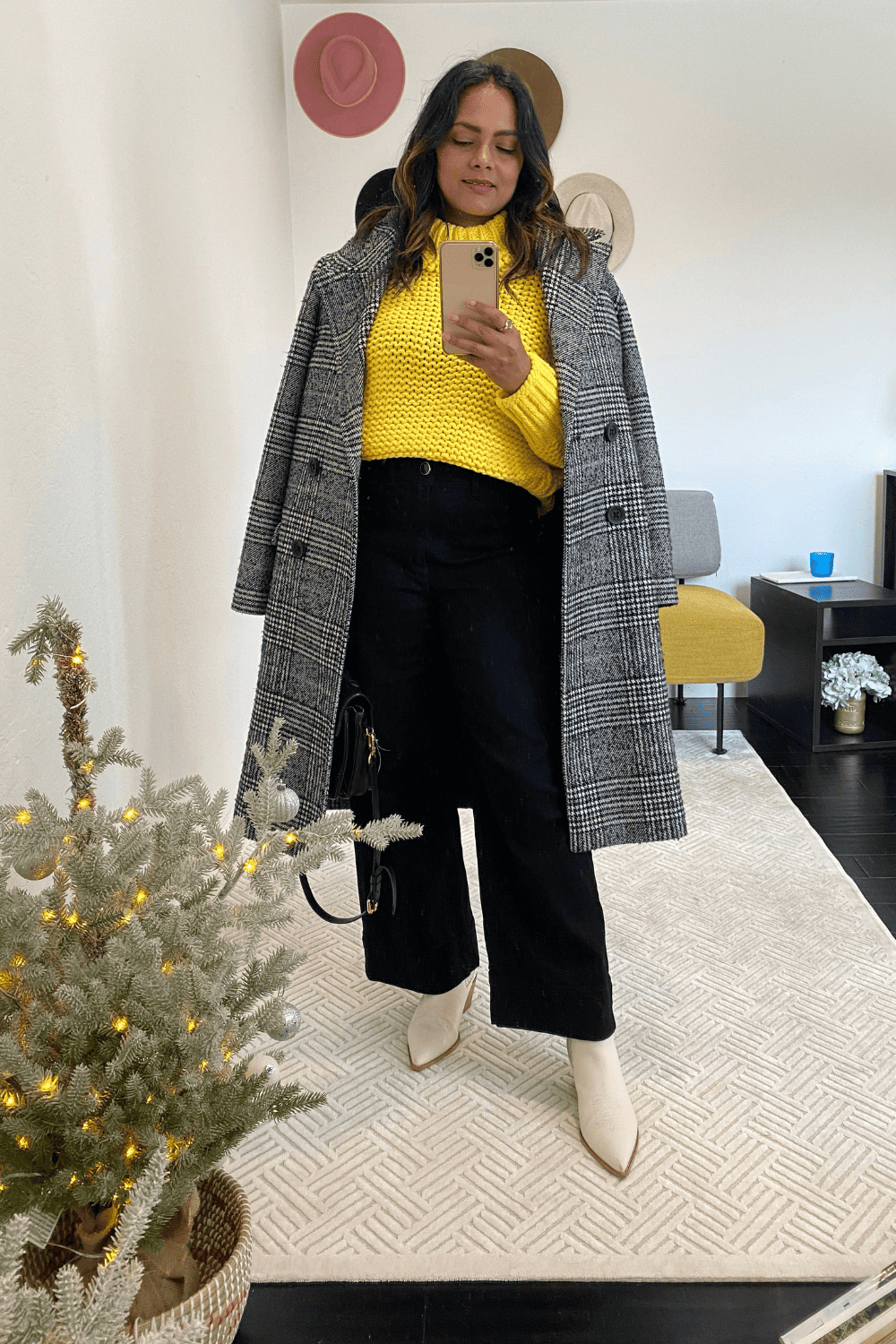 The long coat hitting you around the same length as the midi dress won’t make you look shorter because the outfit is not creating multiple breaks on your body.