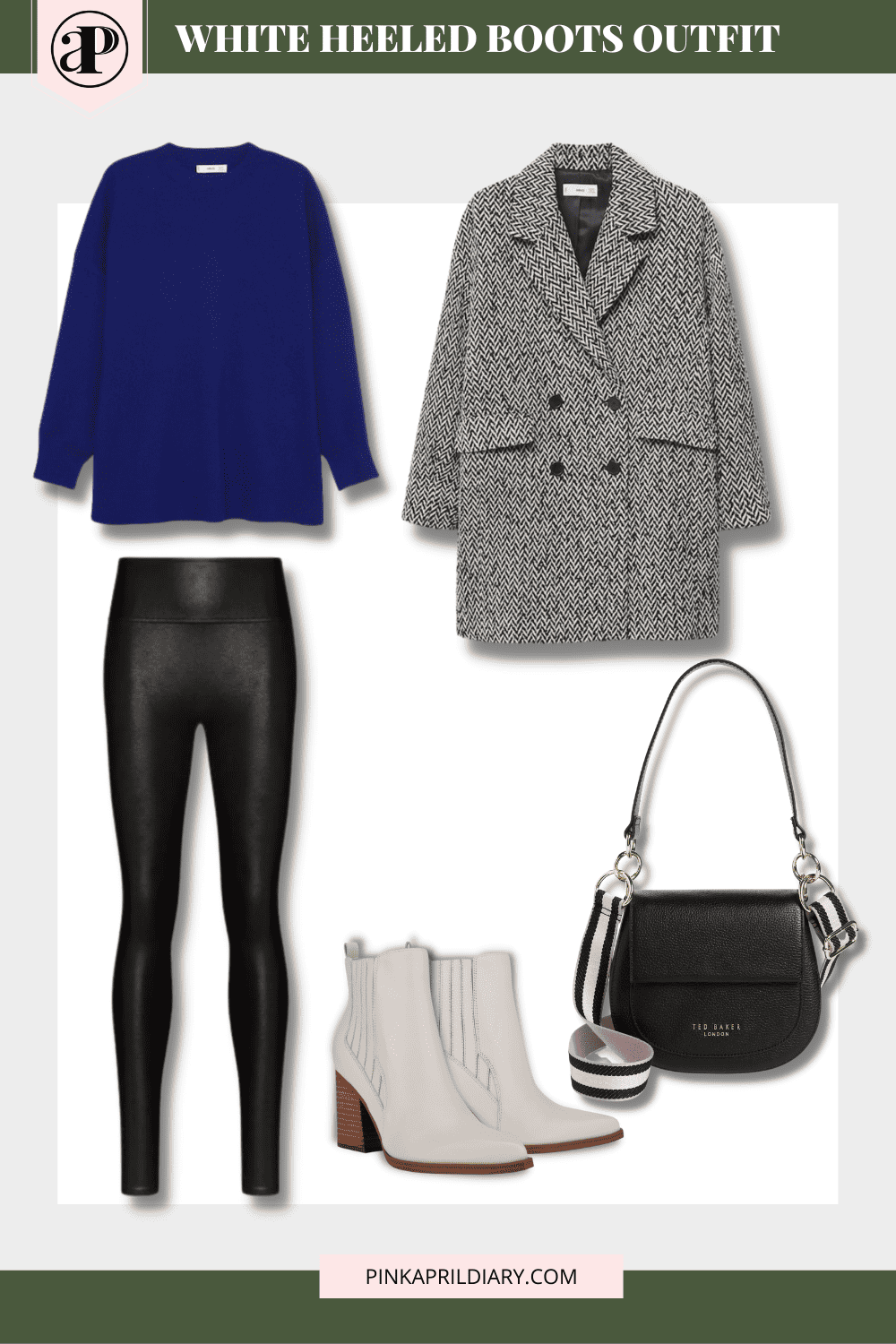 This is because of the boots being in a neutral ankle boots with heels. The long oversized sweater and he similar length of the blazer coat will create an edgy yet effortless fall and winter look where you can still rock these white ankle boots.