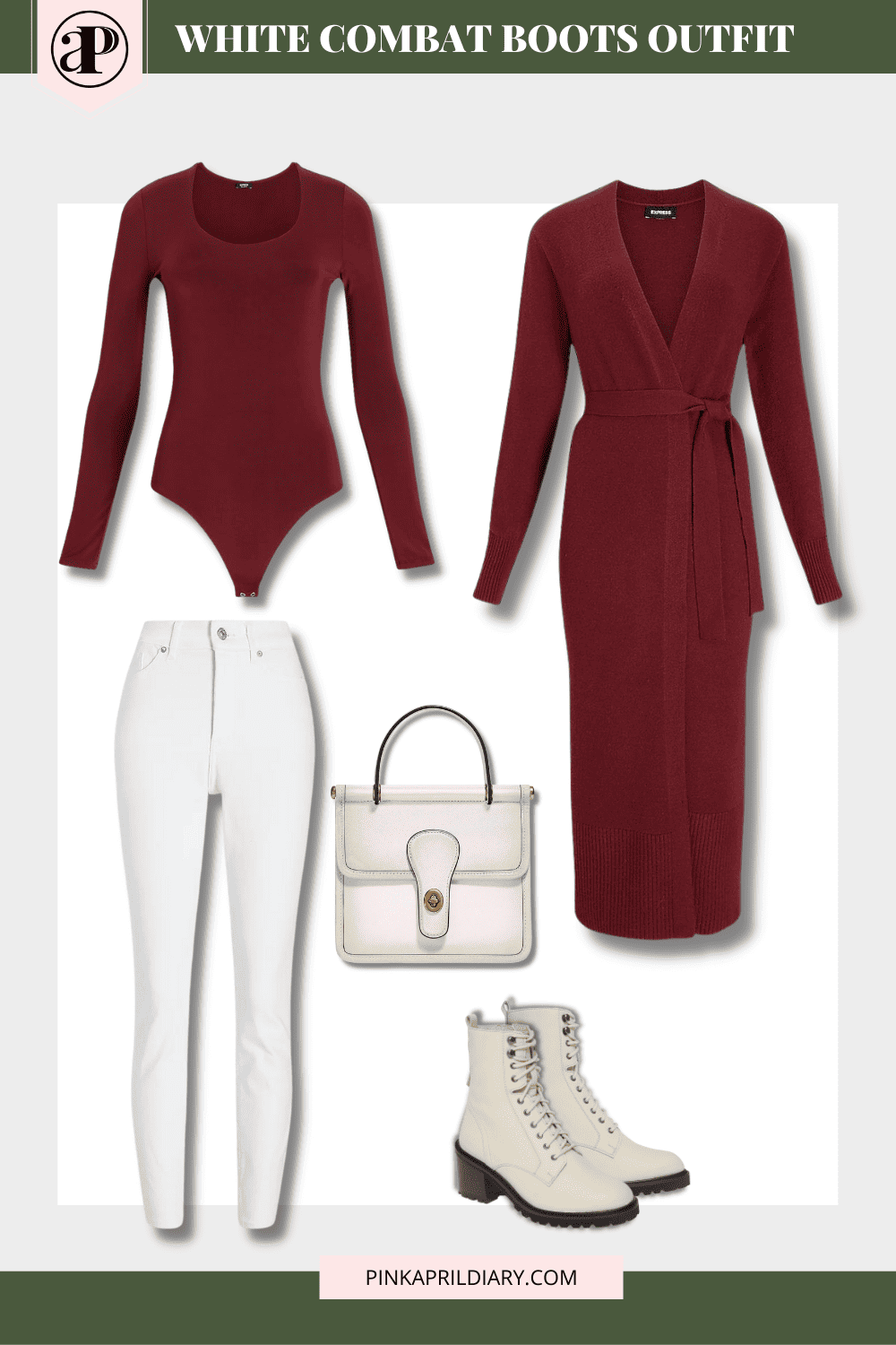 [Curvy White Skinny Jeans] | [Scoop neck Bodysuit] | [Long Cardigan] | [Top Handle Bag] | [White Combat Boots]