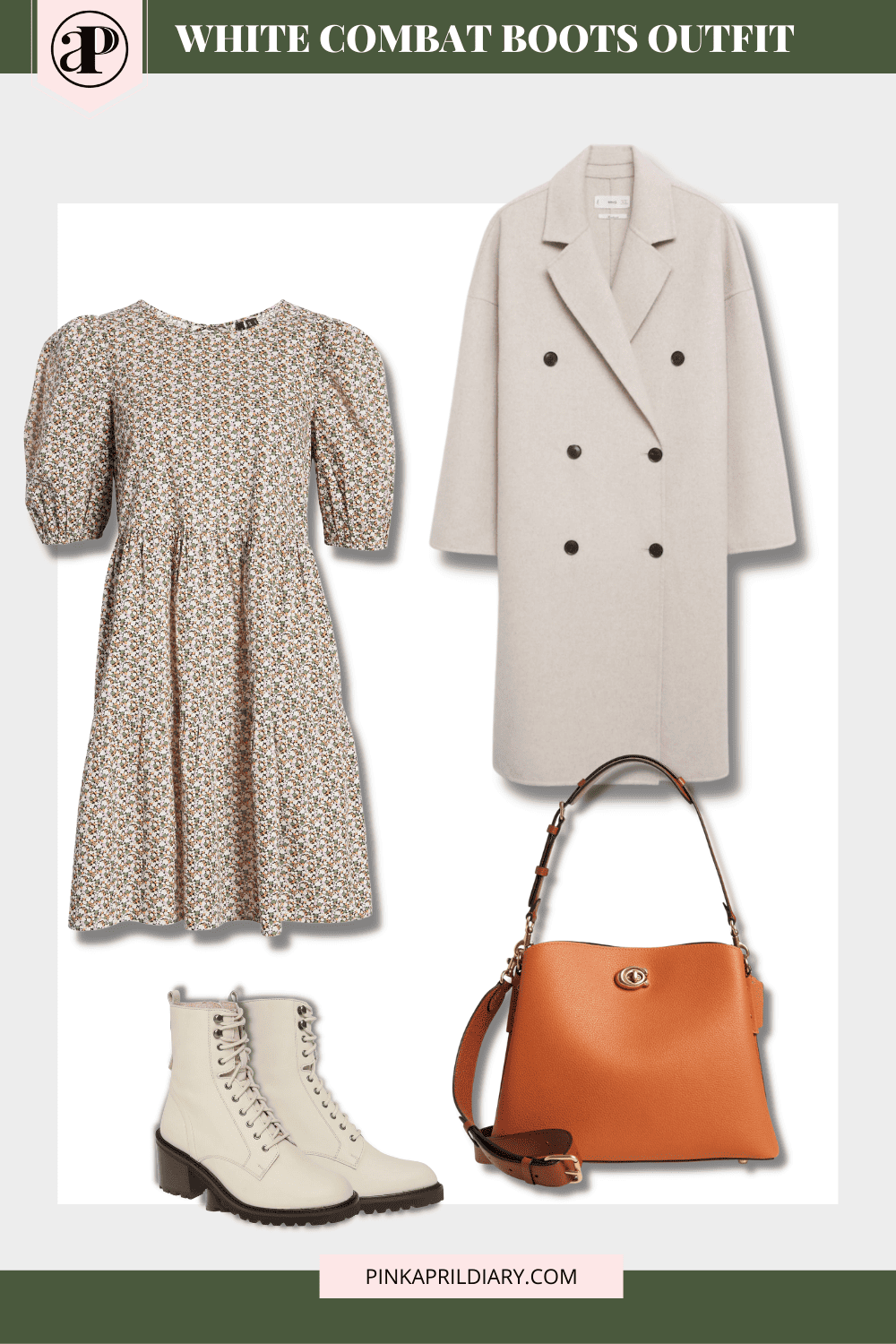 [Printed Short Dress] | [White Wool Coat] | [Brown Medium Bag] | [White Combat Boots]
