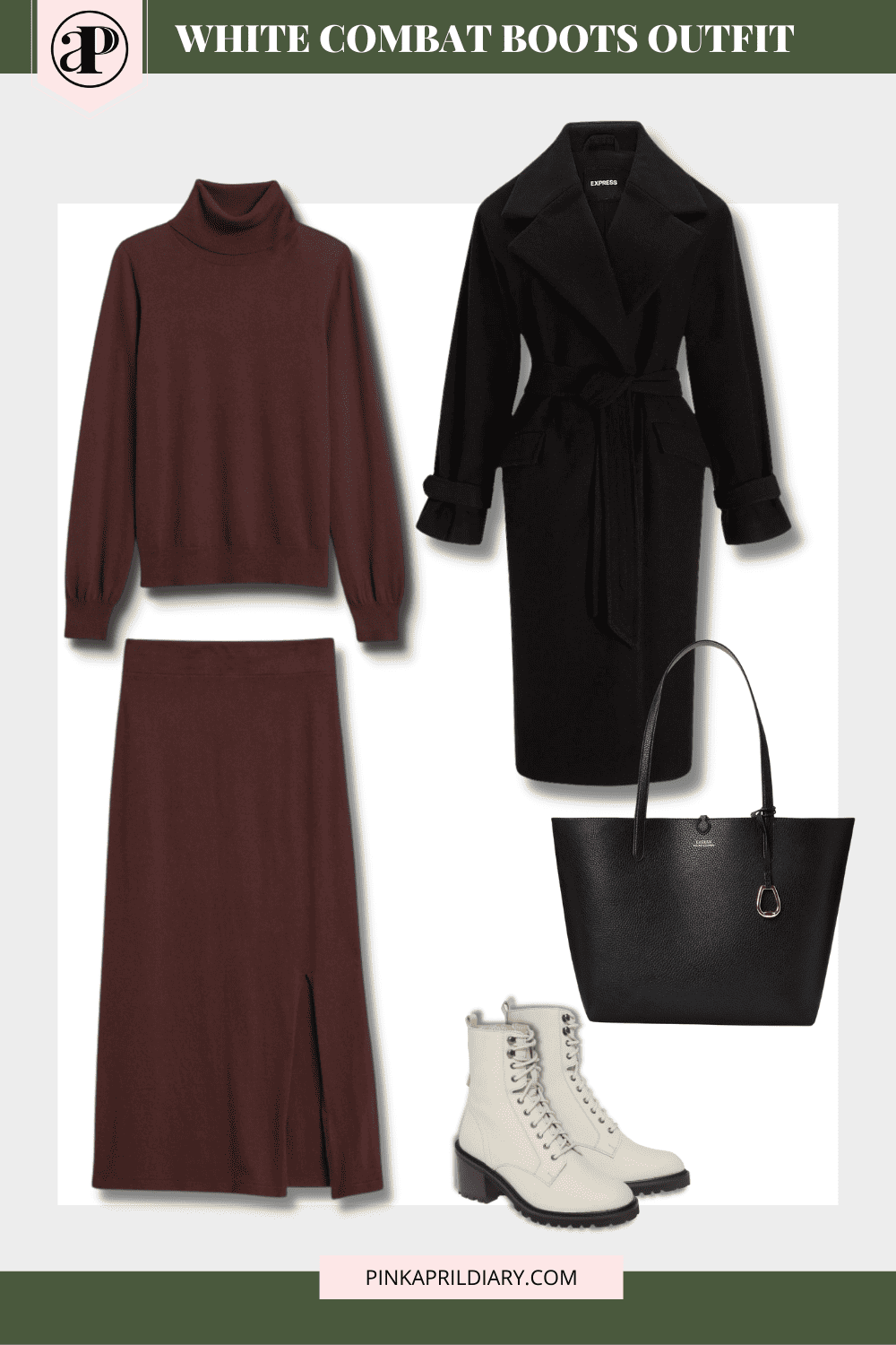 This outfit is a great work look for fall and winter. In fall you can just wear the turtleneck sweater and skirt set and the combat boots.