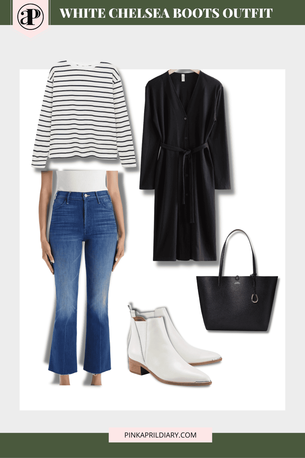 [Cropped Frayed Jeans] | [Striped T shirt] | [Black Long cardigan] | [Black Tote Bag] | [White Chelsea Boots]