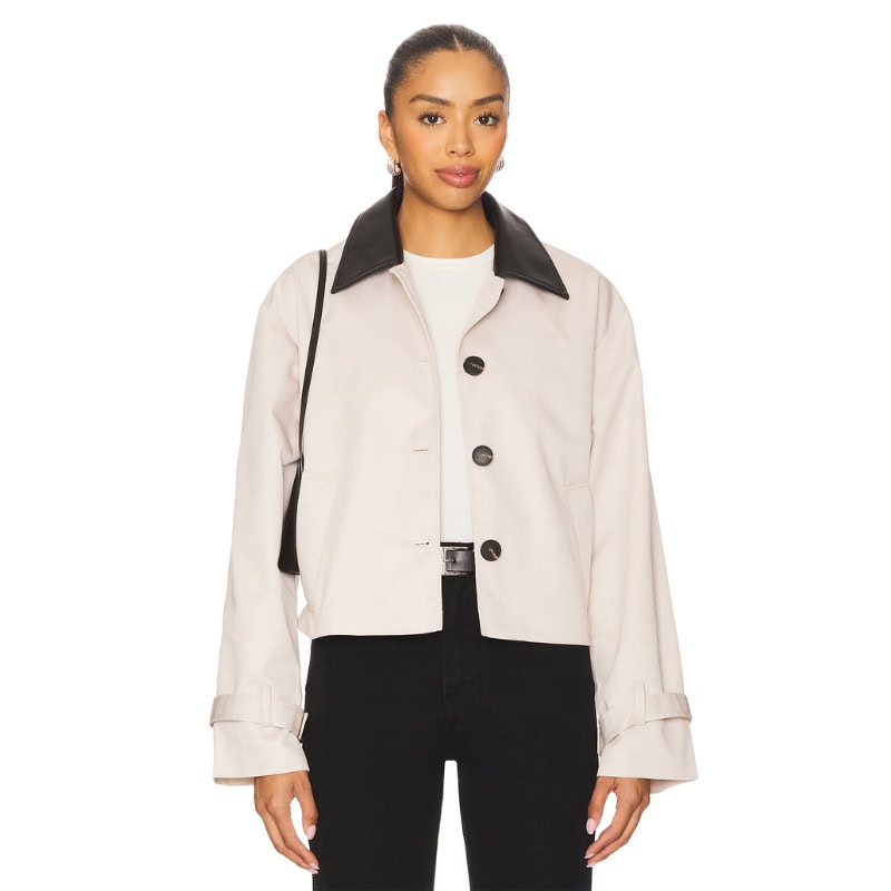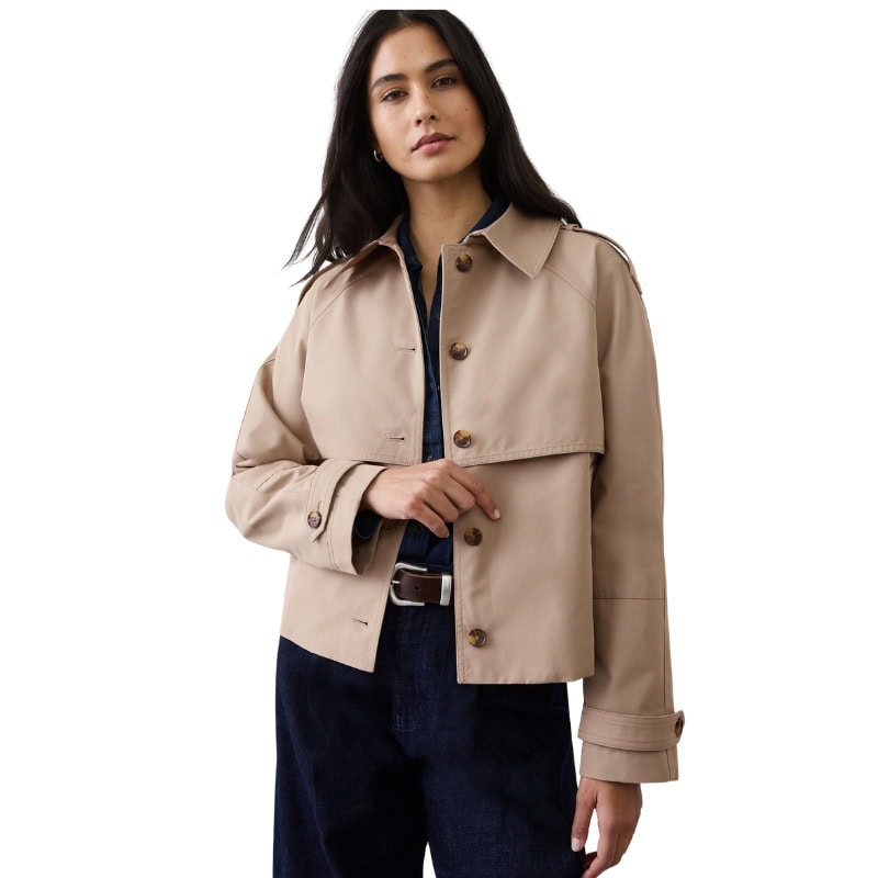 These jackets are usually called cropped trench or collared jackets. But they are not too long and that is why they look flattering with relaxed bottoms.