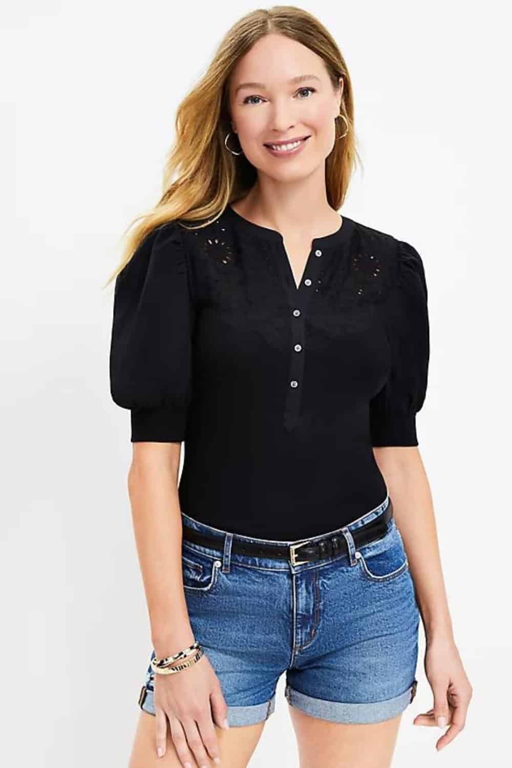 A puff sleeve style of top will naturally look chic and summer ready. If you find one with embroidery or lace details, then it’s going to look better than any normal black Tshirt.