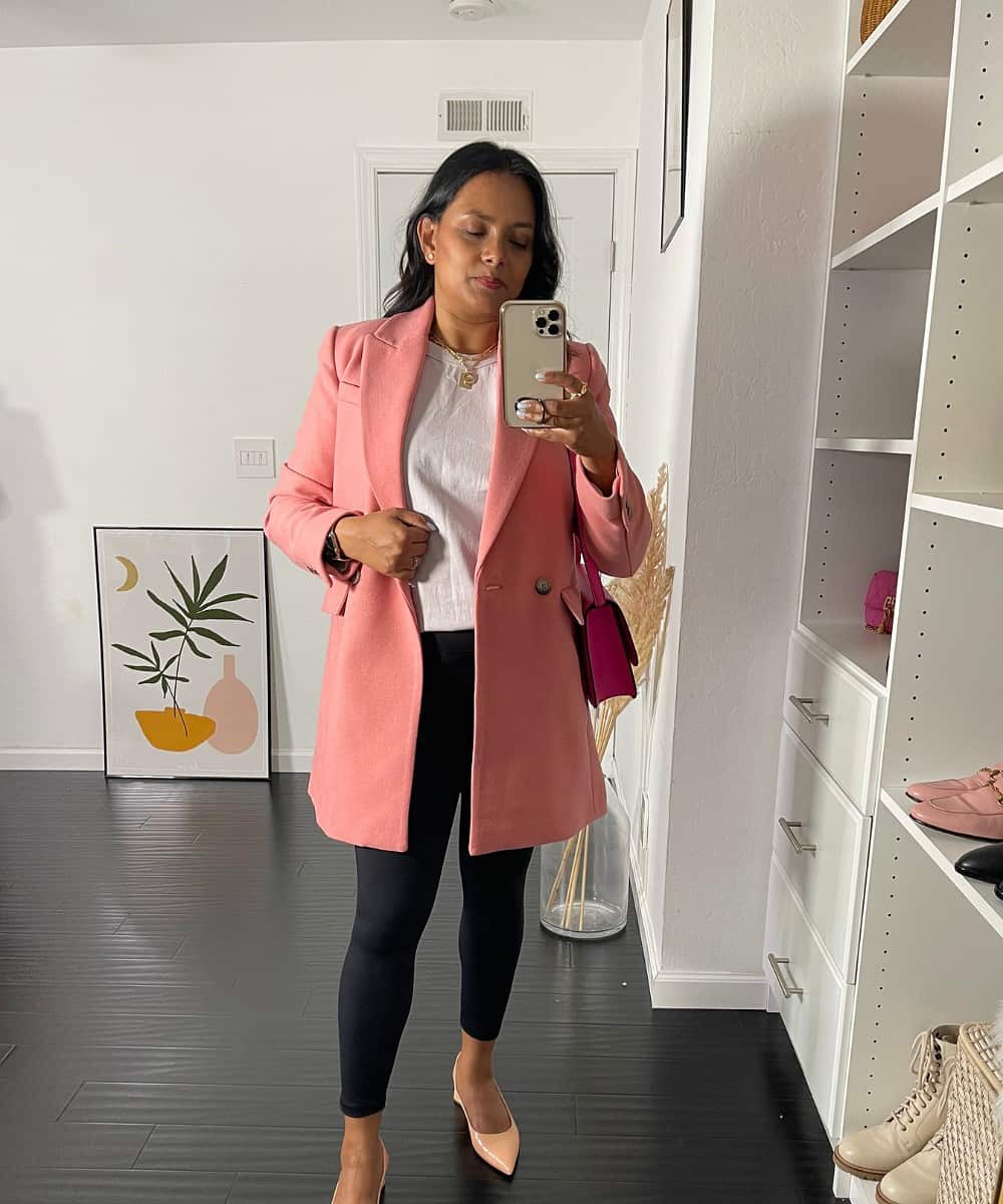 If you have an oversized pink blazer, you can pair it with your black leggings to elevate the outfit.