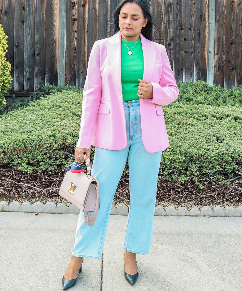 Straight leg jeans in general are really versatile and they look great with pink blazer as well as they look like pants because of the straight silhouette.
