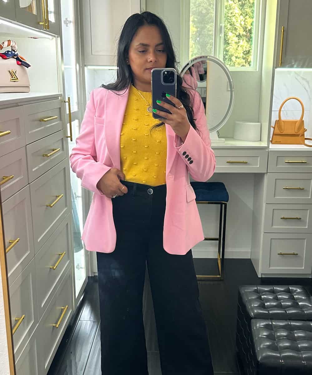 Wearing your pink blazer with the right colors is key to looking put together. I also want to ensure that you don’t waste a ton of time trying to figure out what colors to pair your pink blazers with.