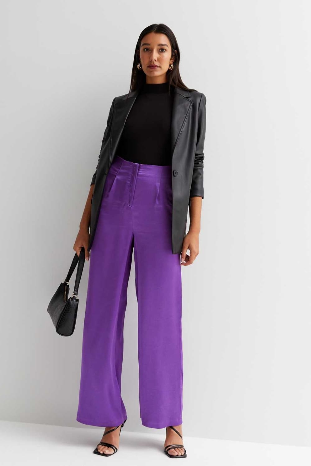 This purple satin pants outfit looks specially chic because the black sweater and black leather blazers have different texture adding more interest in your overall look.