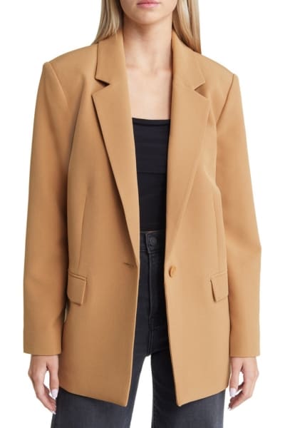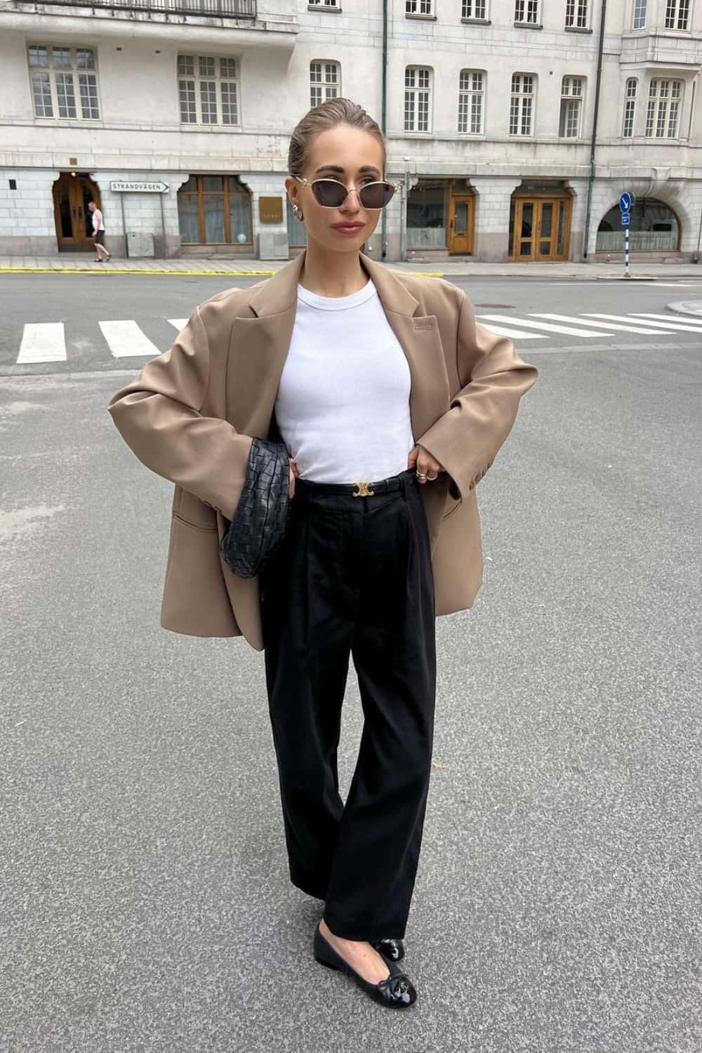 Pair our favorite white tee and a tan blazer for a classy and sophisticated outfit that you can wear from day to night by simply swapping your accessories.