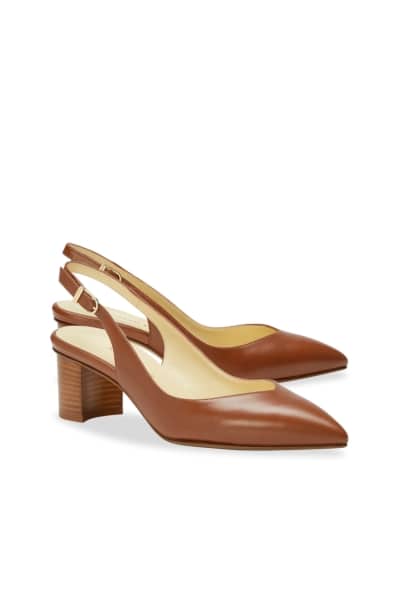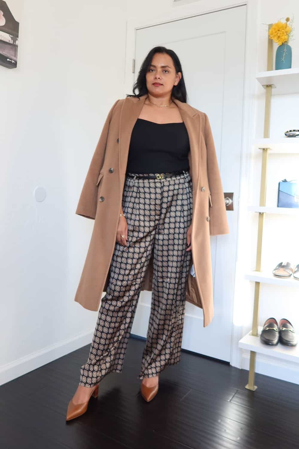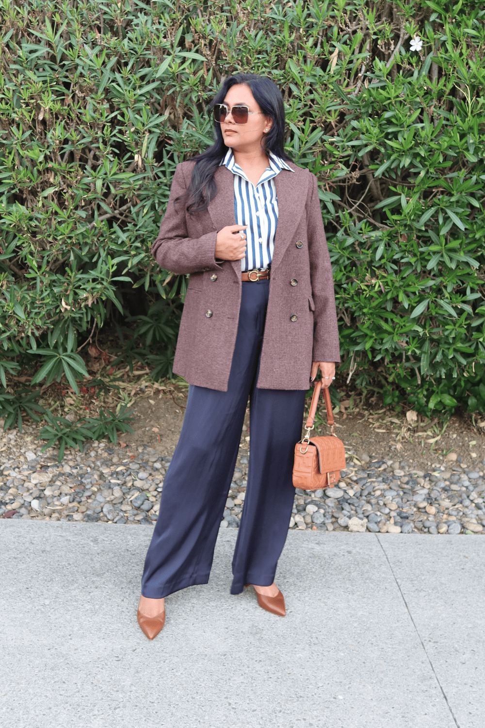 Added slingback pumps in brown tone to create a color variation and matched the blazer shade with the pumps. This way the satin pants outfit looks polished without a lot of focus on the pants.