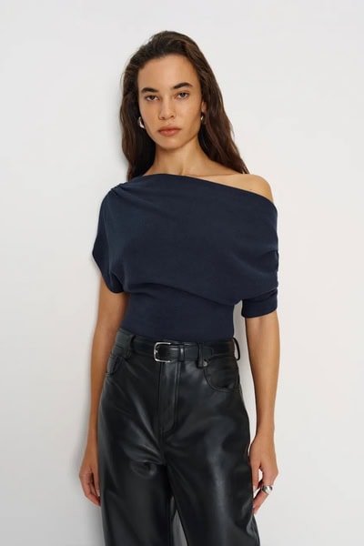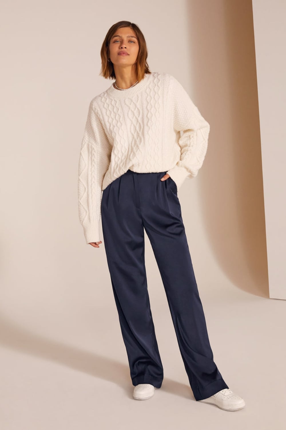 The oversized cable knit sweater balances the minimal style of the satin pants. This is a great way you can rock your favorite chunky sweater and look modern.