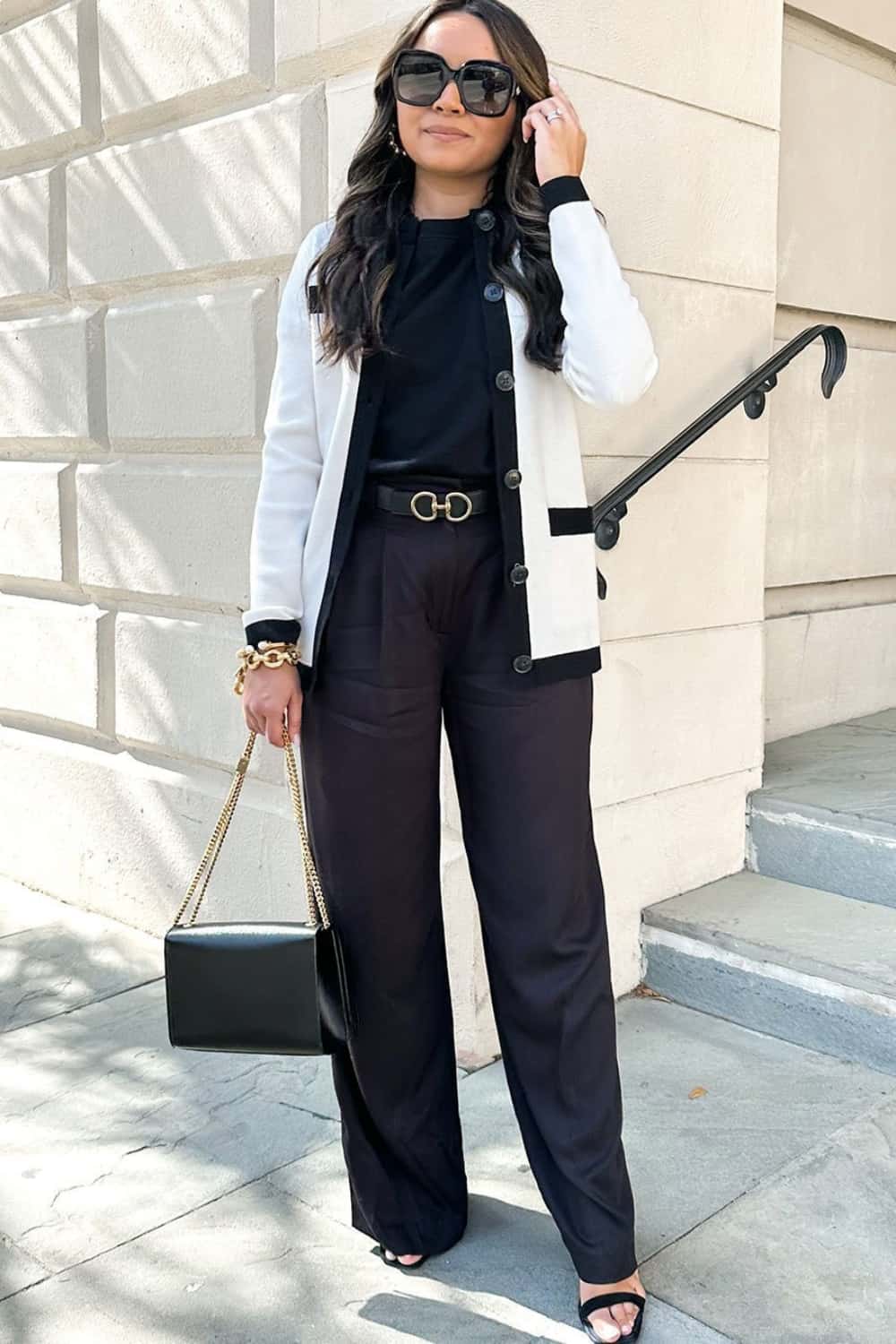 This satin pants outfit is great to take from day to night which you can easily create with a black or dark navy satin pants with black crewneck tshirt. And add a third layer with a chic cardigan with button detail.