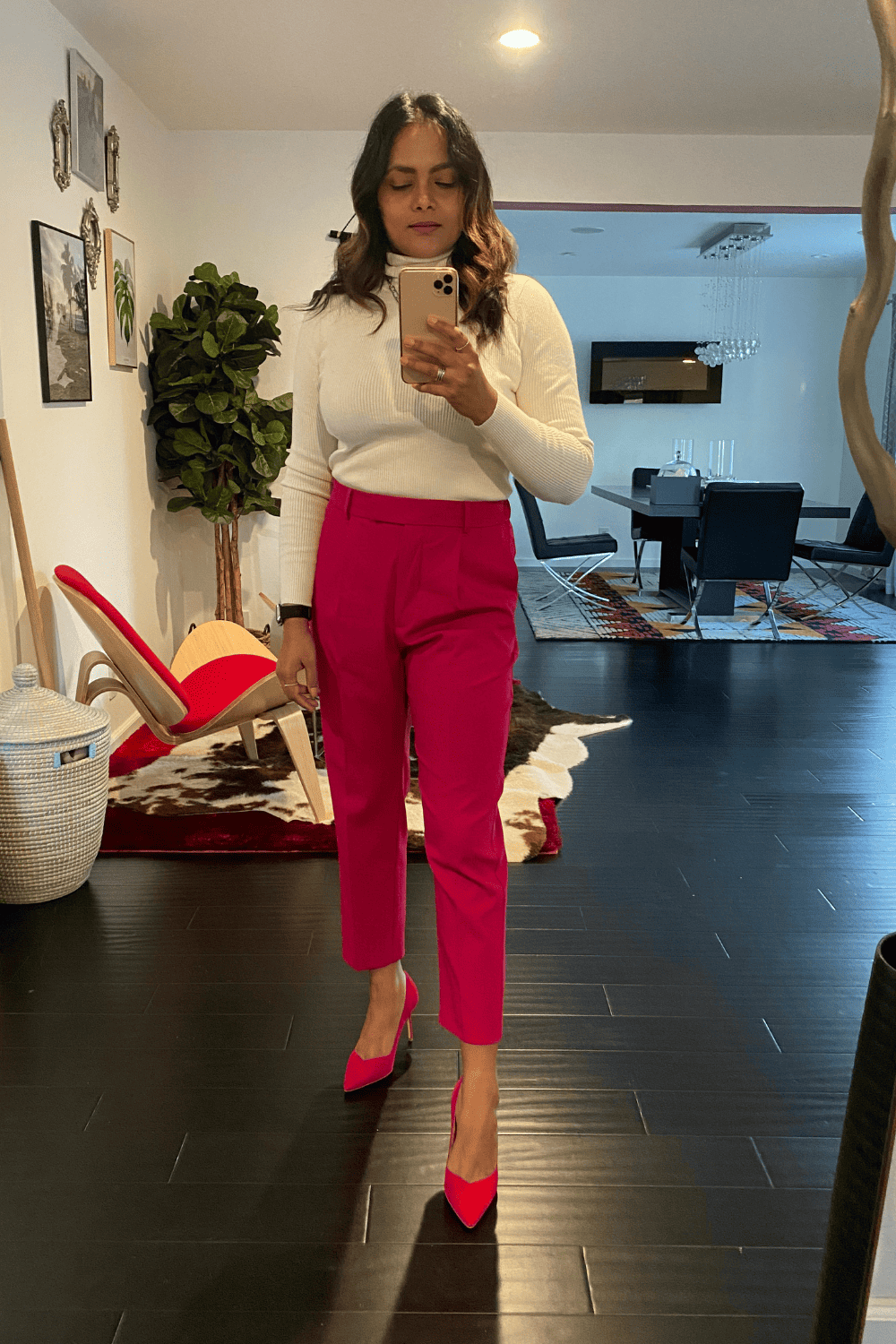 You can also go all white with a white sweater and white wide leg pants. A turtleneck is an elevated version of sweater that makes your outfit look expensive.