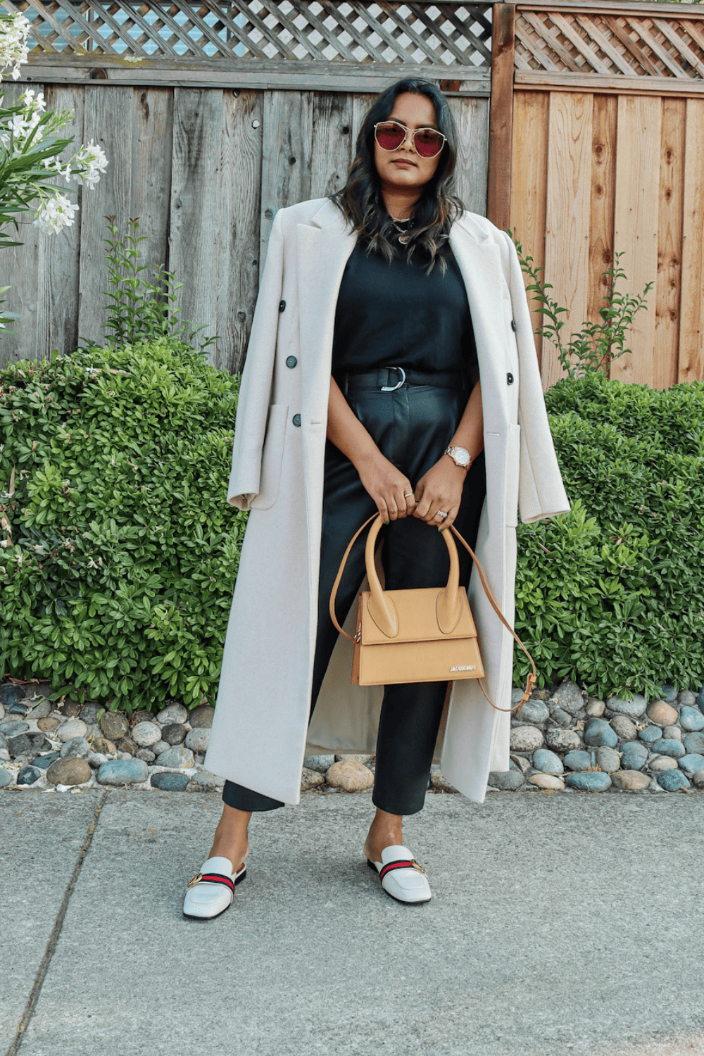 White Coat + Black Tshirt + Black Leather Pants + Loafer Mules