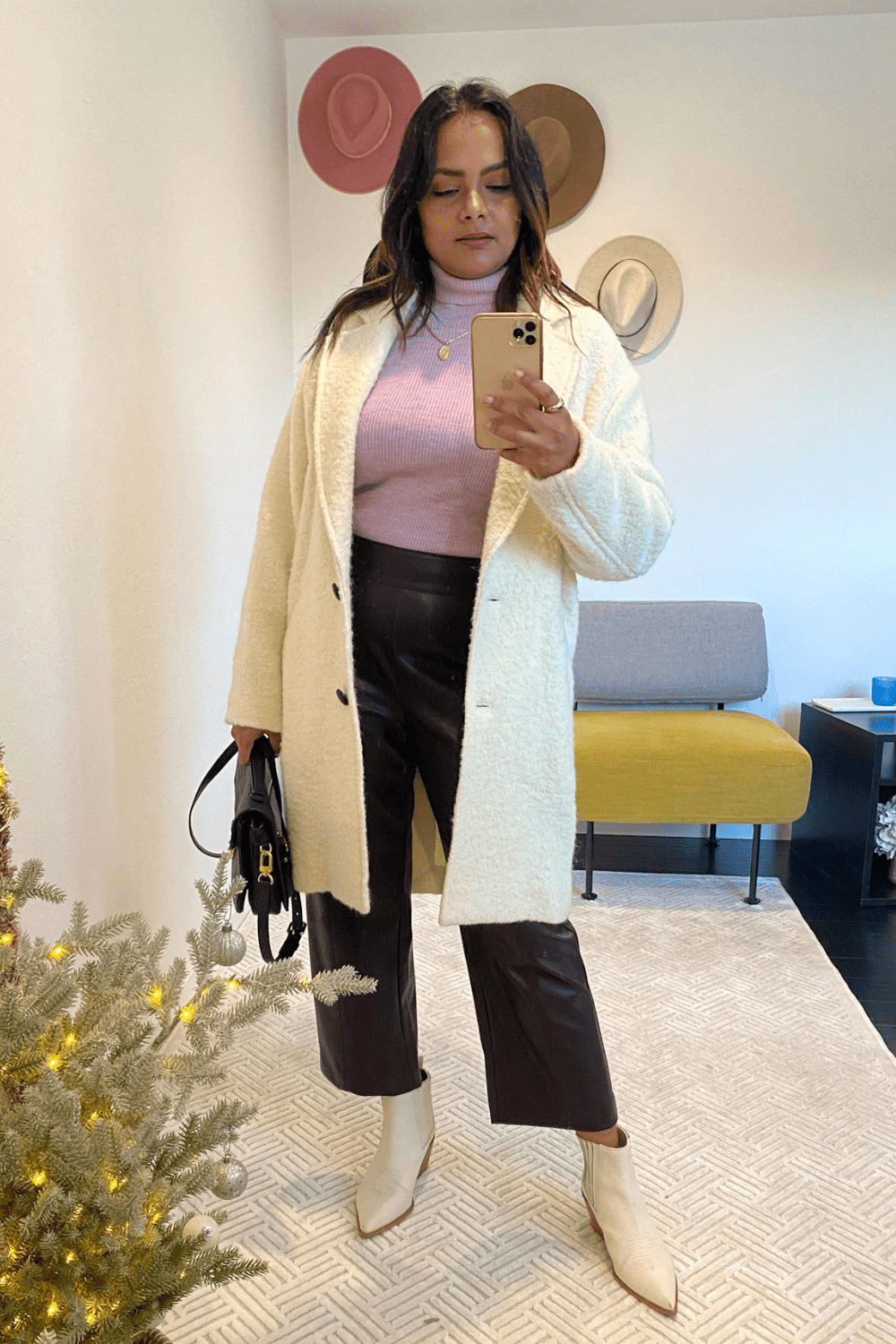 White Coat + Turtleneck + Leather Pants + White Boots