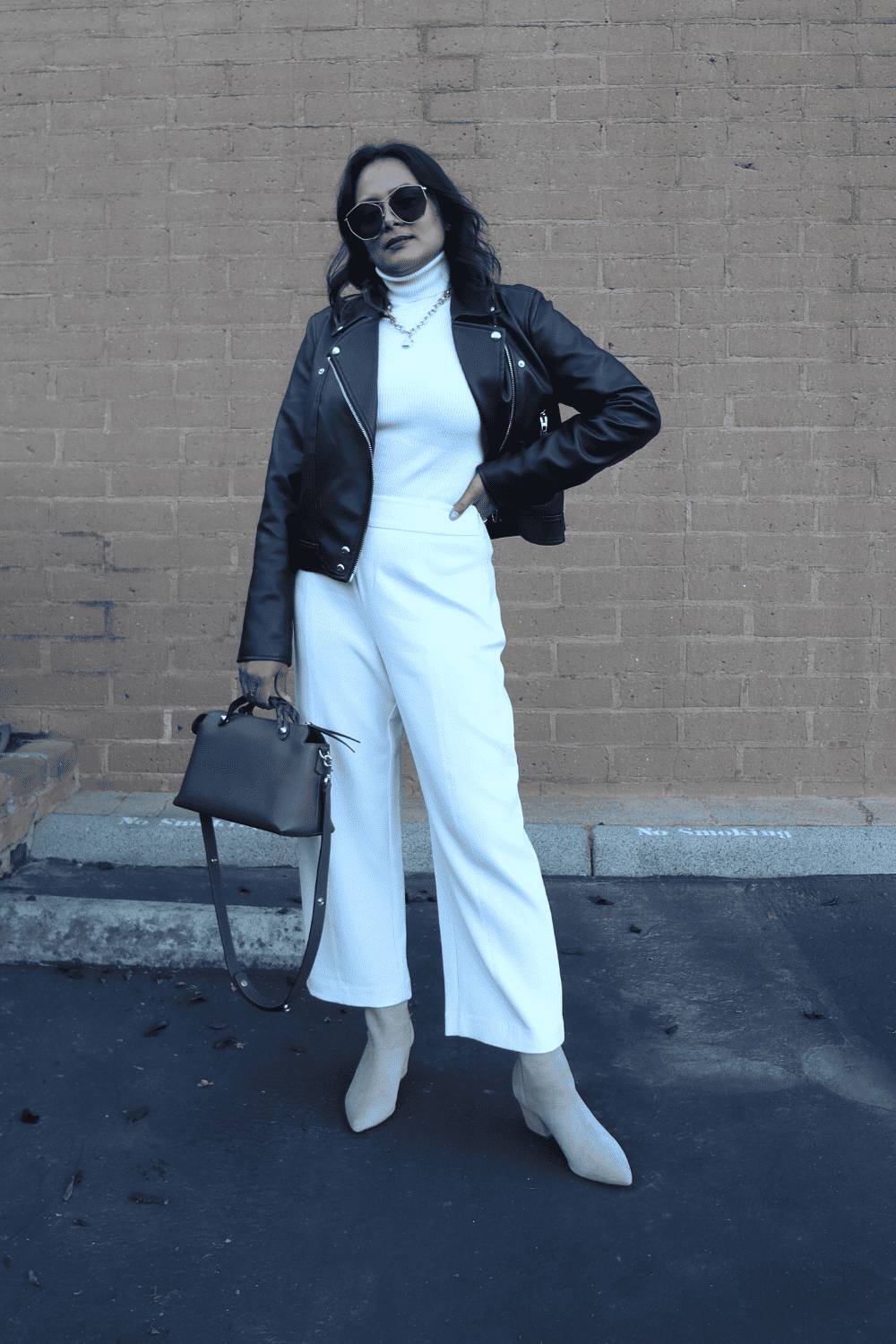 White Pants +White Turtleneck + Nude Boots + Leather Jacket