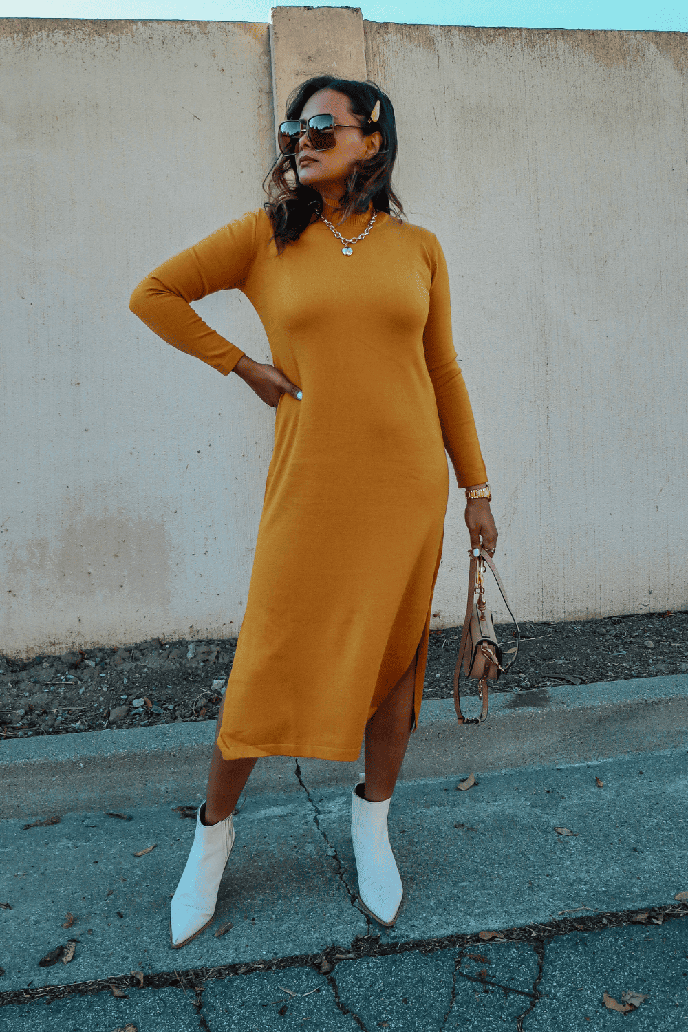 You look ready for fall and the white ankle boots make your outfit luxe. And this is an easy way to wear any colored sweater dress.