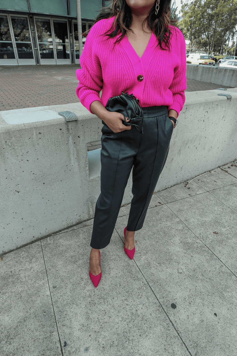 An all black look with leather pants can also be a classic for holiday parties where you want to be a bit more sophisticated. Work parties are an excellent example. I added a snake skin slingback mule to break the all black look here.