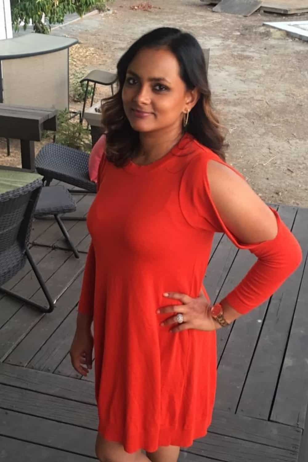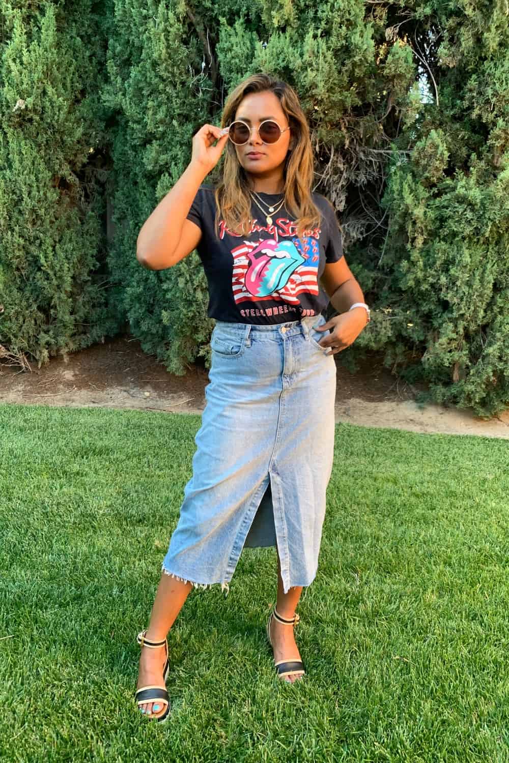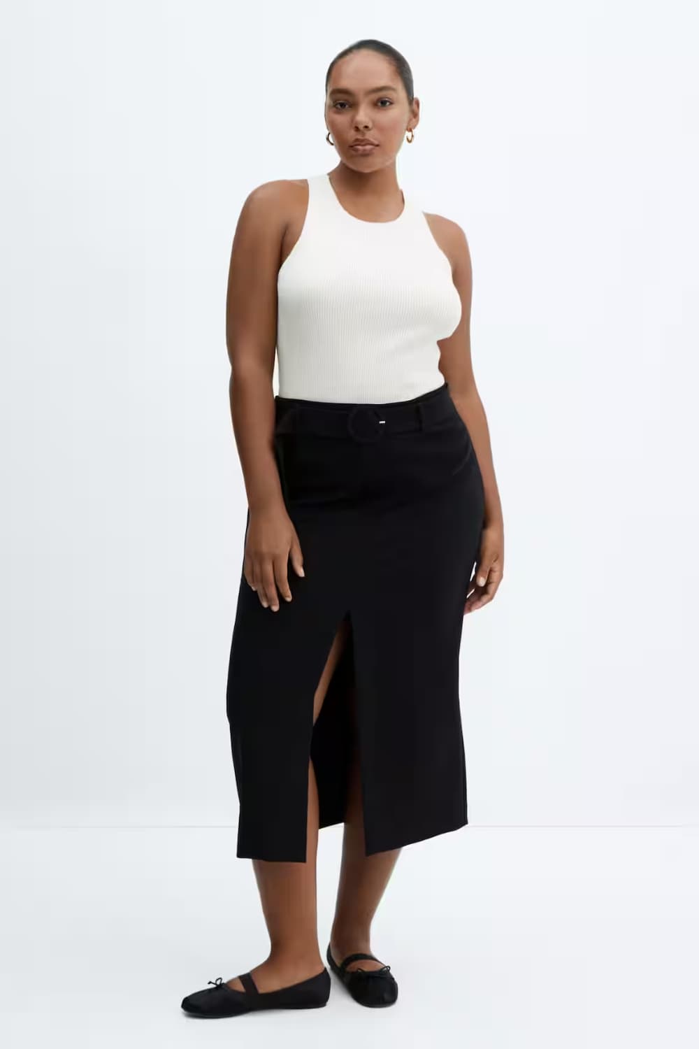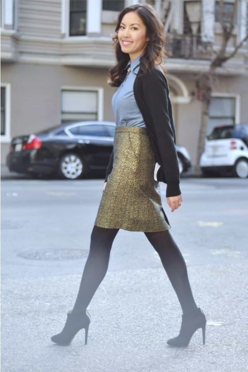 But now that our bodies have changed, I don’t these skirts feel great to wear. An easy swap is to wear pencil silhouette skirt with front slit. These skirts are made of either denim, cotton, wool or other thicker material. So they don’t hug your body like the jersey skirt would. So, it looks relaxed and flatters your body.
