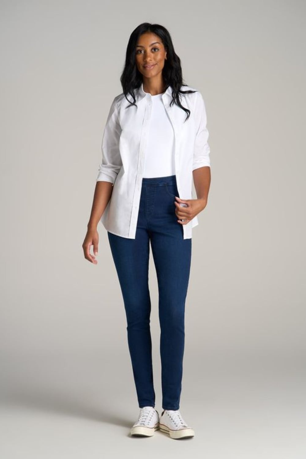 There are wide leg jeans, straight leg jeans, mom jeans and so many styles of jeans that look flattering and sophisticated. Why not try those.