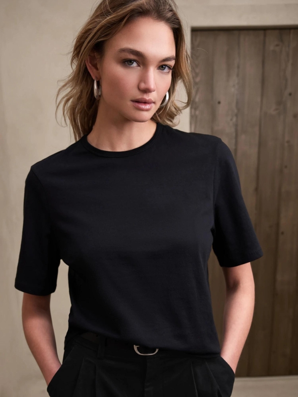 How do you pull off that effortlessly stylish, global feel with a select few essential pieces? A blazer in navy blue. This combo exemplifies the ability of a single, well-fitting, and really stylish jacket to change an outfit. The blazer looks great worn over a chic black t-shirt, demonstrating the power of simplicity when done well.
