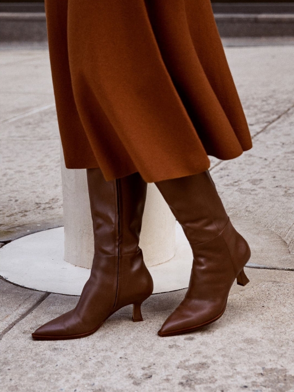 Matching the blazer with a clean white shirt makes it appropriate for both the patio and the workplace. Form-fitting denim brings the look down to earth and strikes the ideal mix between refinement and relaxation. The standout piece of the ensemble is the knee-high caramel boots, which lengthen the legs and give the entire thing an opulent look.