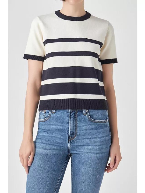 Striped Sweater Top + Navy Satin Pants + White Slides