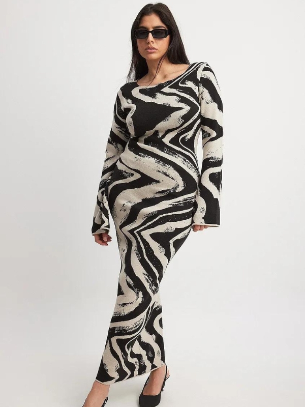 The craftsmanship continues under the jacket with a striking, defiantly ordinary dress patterned after inkblots. It contrasts strikingly with the solid blazer thanks to its long, flowing lines and monochromatic color scheme. This painting honors abstract expression in motion, not simply a garment.