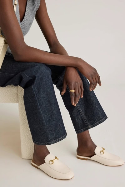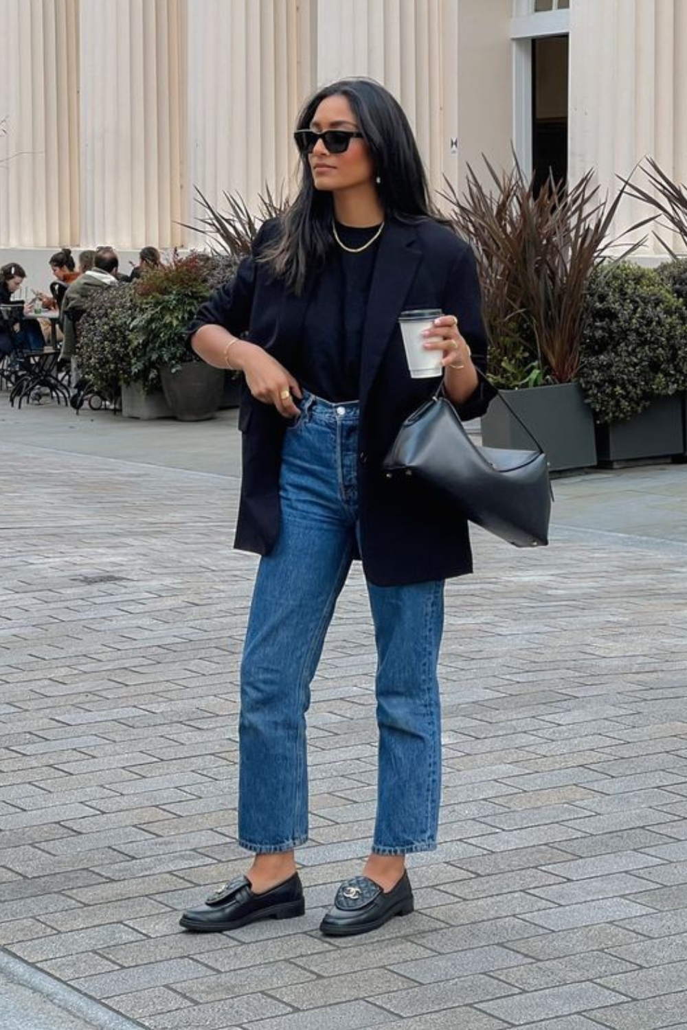 The story continues with a wardrobe staple that adds a touch of carefree poise: classic straight-leg jeans. Denim conveys a sense of sophistication without being too pretentious. Furthermore, the shoes—oh, the shoes! Modern take on glossy black loafers that provide just the appropriate amount of sheen without going too far.