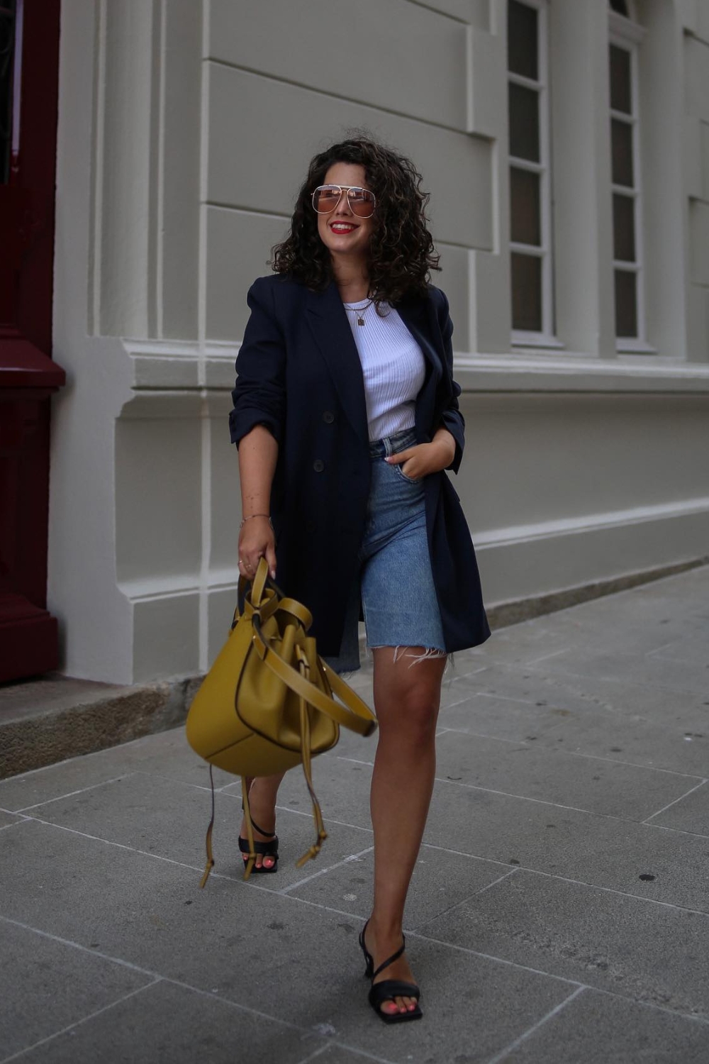 Break the mold with this modern twist on a navy blue blazer outfit. Consider a bright, fitted blazer that means business, coupled with the unexpected edge of denim shorts, frayed at the hem for that perfect blend of polish and play. It’s a style statement that champions versatility.