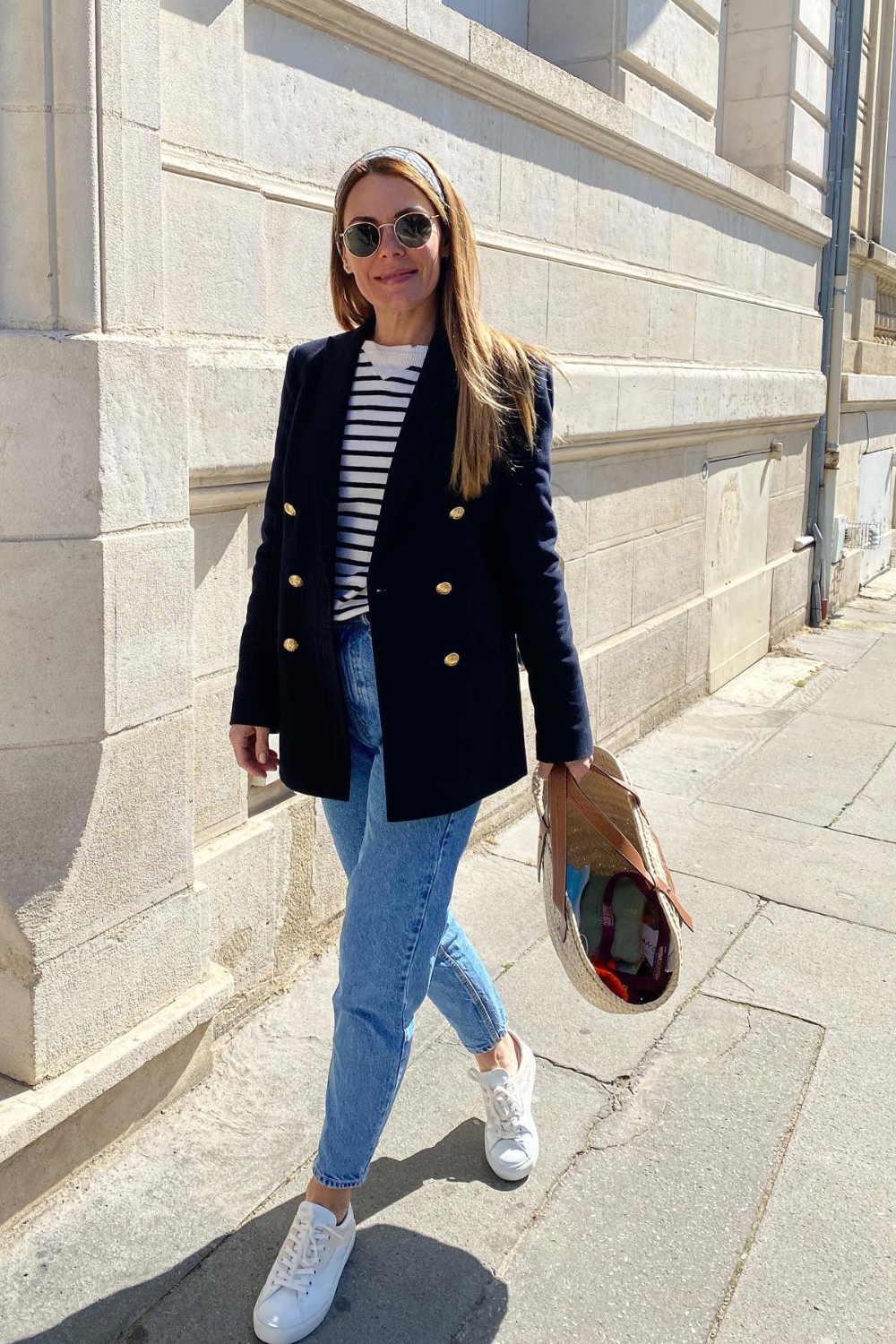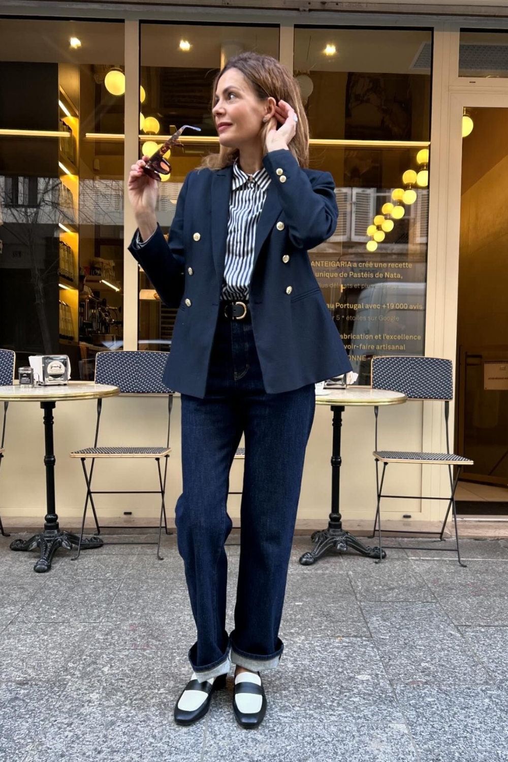 Here’s how a navy blue blazer can effortlessly elevate your outfit from casual to sophisticated without seeming forced. The key element is this timeless double-breasted blazer, which adds a nautical flavor with its gold buttons and a structured design.