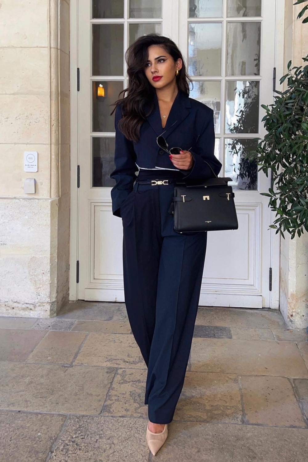 Who says your daily attire can’t have the same professional feel as something from an upscale fashion magazine? Let’s examine an outfit that changes everything and turns your sidewalk into your runway. To start, a perfectly fitted navy blue jacket with prominent gold buttons falls just the right amount over the shoulders to exude power.