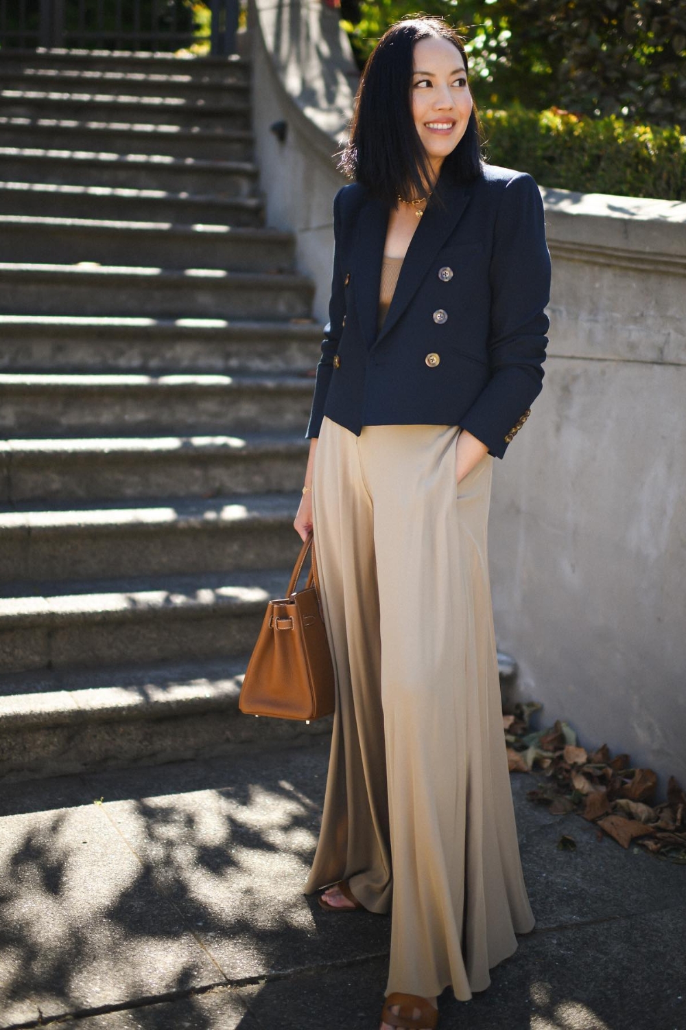 A hint of fluidity and join counterbalances the structured silhouette of the blazer when paired with flowing wide-leg pants in a soft beige color. This ensemble proves that high fashion can be both stylish and comfortable; it’s more than just an outfit.