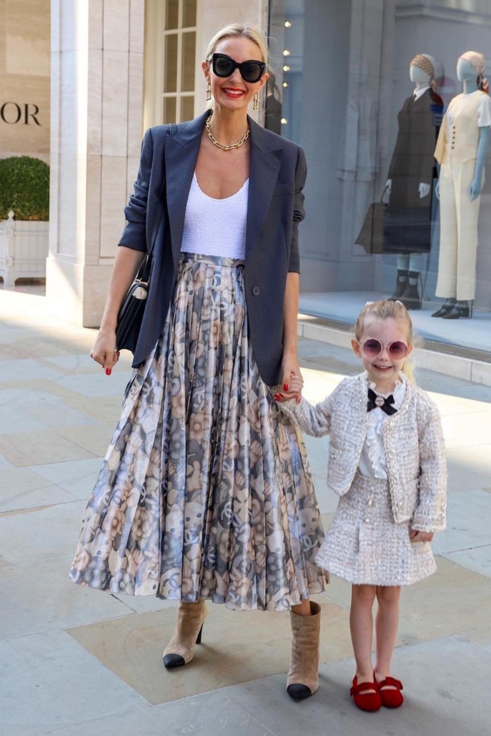 The blazer pairs well with a delicately detailed pleated skirt with a subdued design that speaks volumes without using words. The outfit is a lesson in harmony: the structured jacket and the flowing skirt combine to produce a symphony of looks that is both well-chosen and carefree.