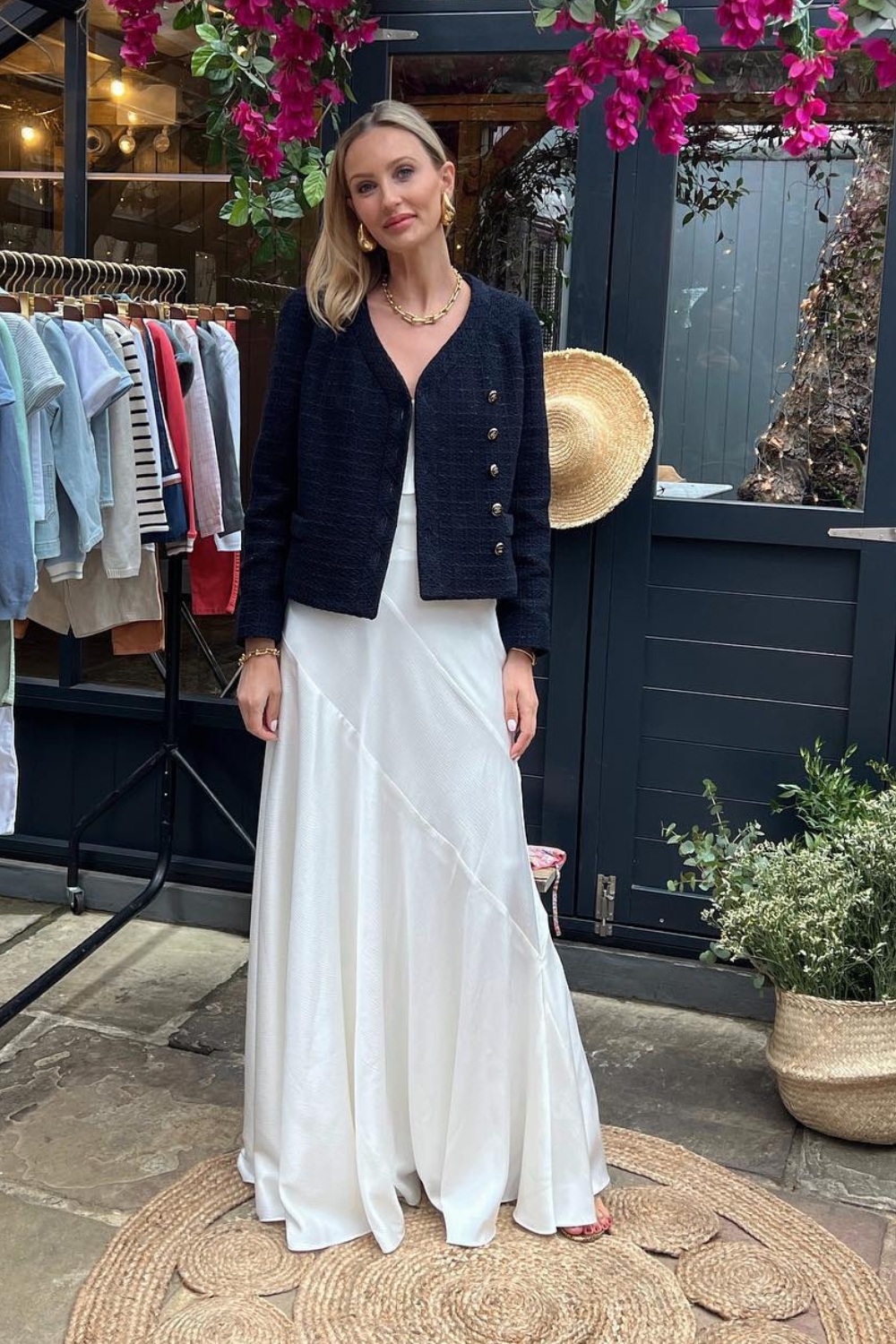 Why should luxury be reserved for special occasions when you can wear it daily? Feast your eyes on this exemplar of daily elegance: a textured navy blue blazer with just the correct detail to make a statement without saying a word. It’s paired with a flowing white maxi skirt, an epitome of grace and comfort with a side of high fashion.