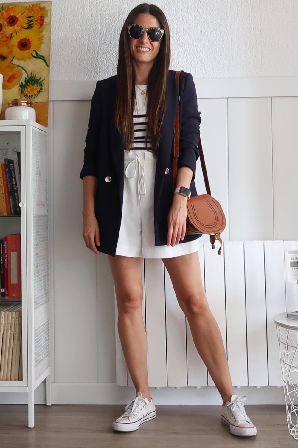 The outfit with the sharp navy-blue blazer says volumes about your own style story rather than merely hanging off your shoulders. It looks great worn with a laid-back striped shirt tucked into high-waisted white shorts, which creates a startling but well-balanced contrast.