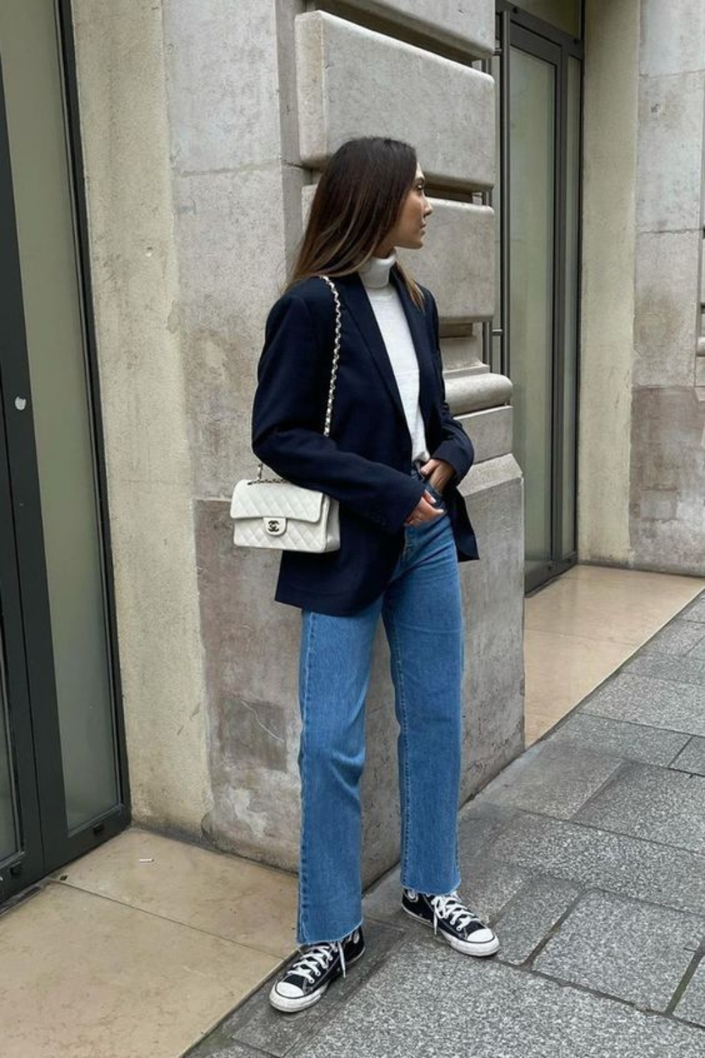 A structured navy-blue blazer, a timeless classic, completes this ensemble well. It’s worn over a spotless white turtleneck, a simple but stylish decision that makes the whole look better.