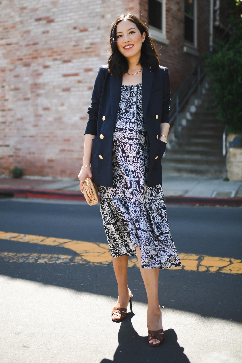 Spring summer is dress season and why not try a navy blazer with your favorite printed dress. A maxi dress looks great with a double breasted blazer.