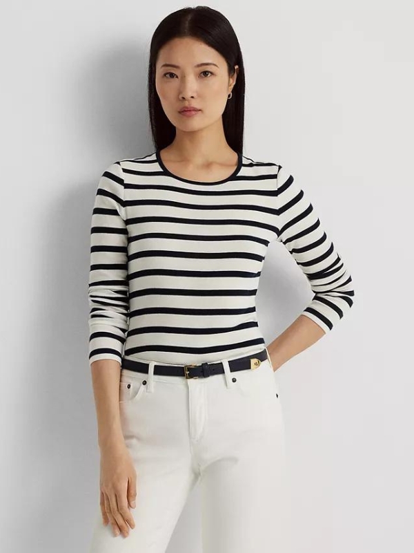 Paired with a crisp, horizontally striped navy-and-white top, it salutes nautical nuances without drifting overboard. The ensemble is effortlessly rounded off with a textured white skirt cut just right — short enough to be playful yet long enough to keep it classy.