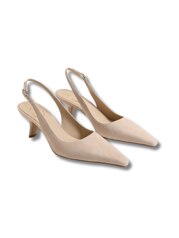 The jacket subtly contrasts, while the plain, modest shirt underneath offers a canvas for personal expression. The ultimate in subtle elegance, the pointed nude heels lengthen the legs and provide a sophisticated sense of style.