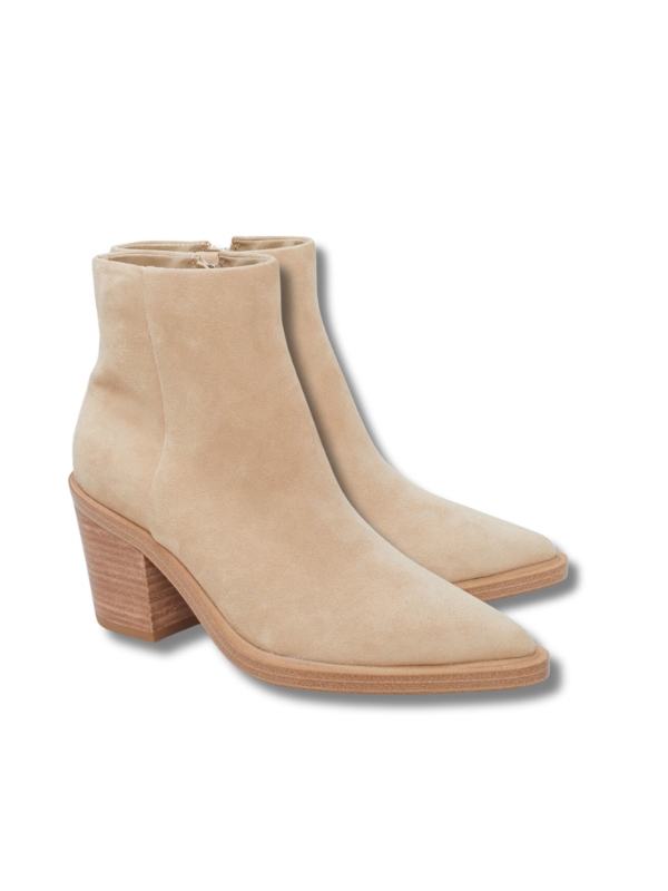 Earthy-hued suede ankle boots are the outfit’s focal point, offering the ideal balance of depth and texture. The combination becomes an open invitation for personal expression when paired with a basic white tank top; decorate to your heart’s content or let the simplicity speak for itself.