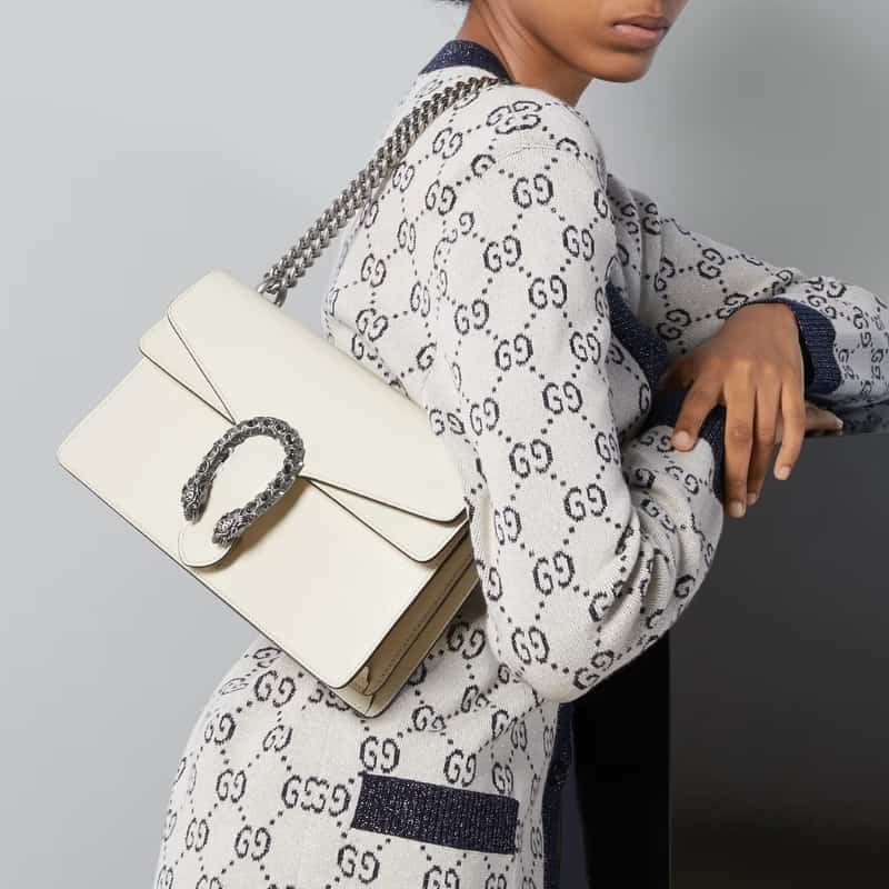 There are no brand logos anywhere. Only someone who knows about the Dionysus Bag would be able to identify the bag. And its sophisticated structure makes it an understated yet statement piece when paired with any outfit.