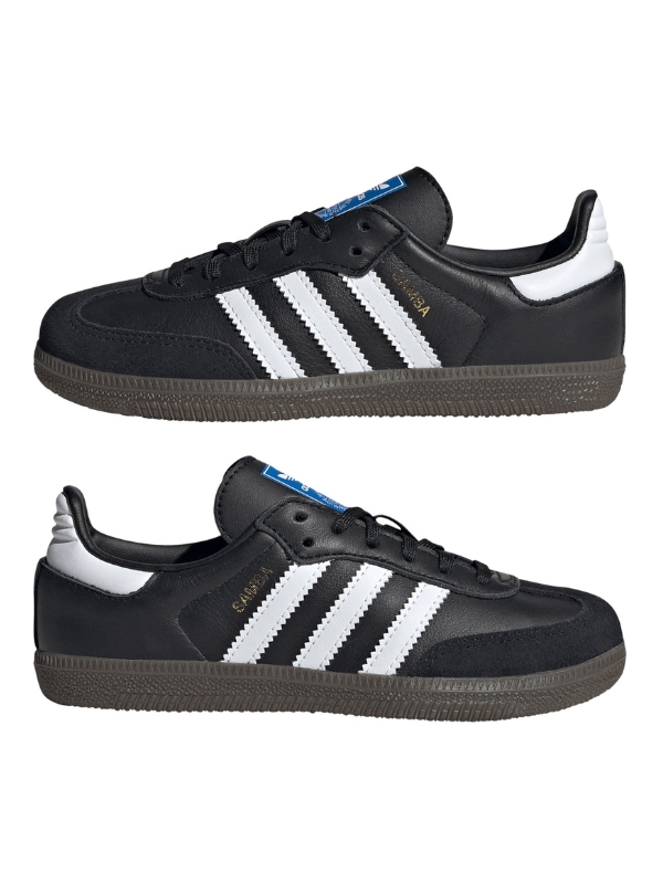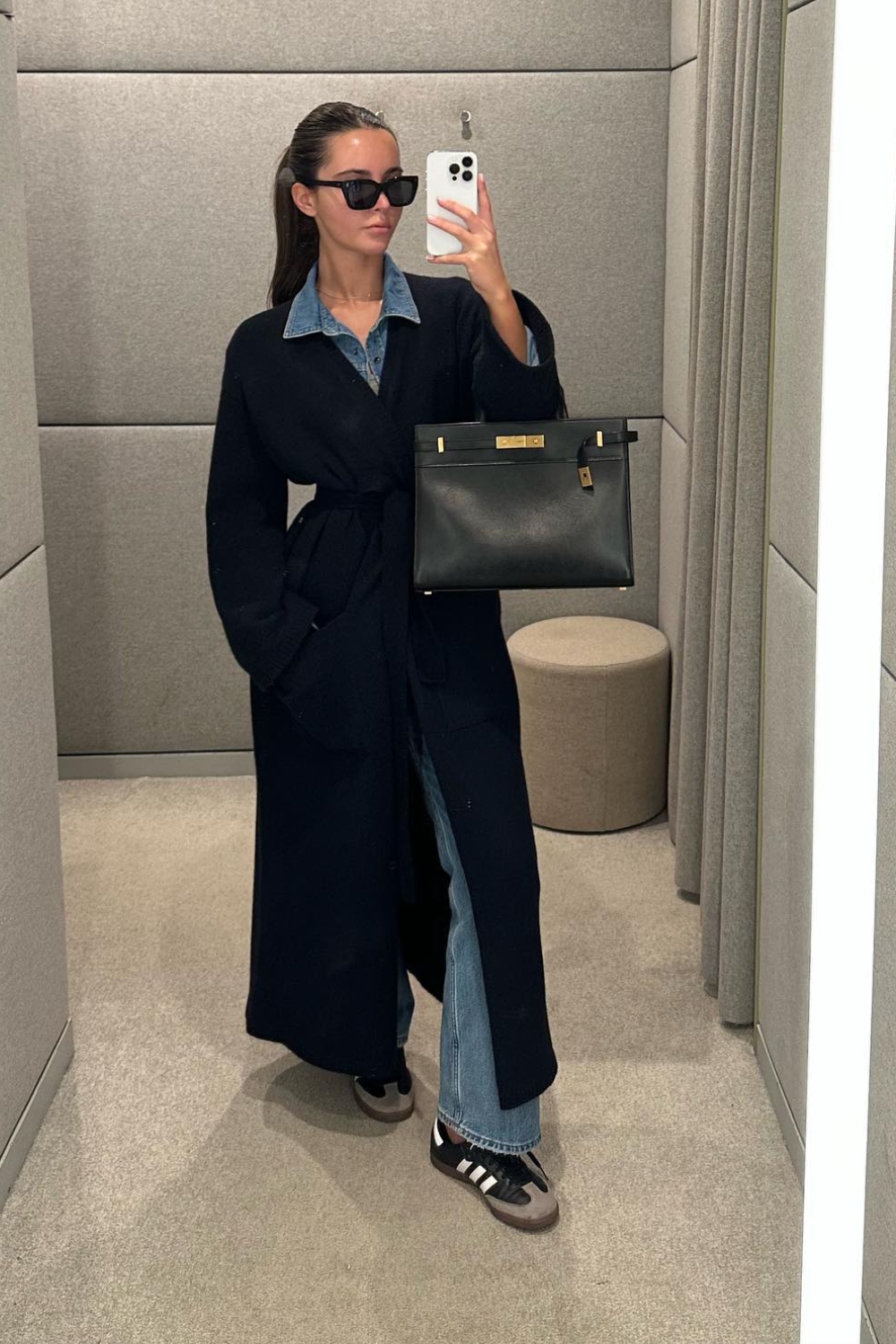 Sport meets refinement in the footwear department. With its recognizable three stripes and tan gum sole, Adidas Sambas gives the outfit an unexpectedly sporty touch.