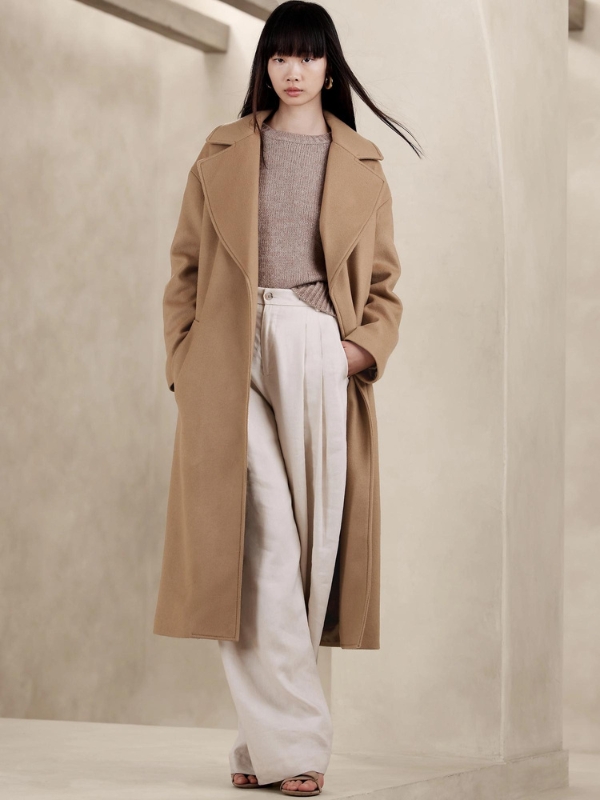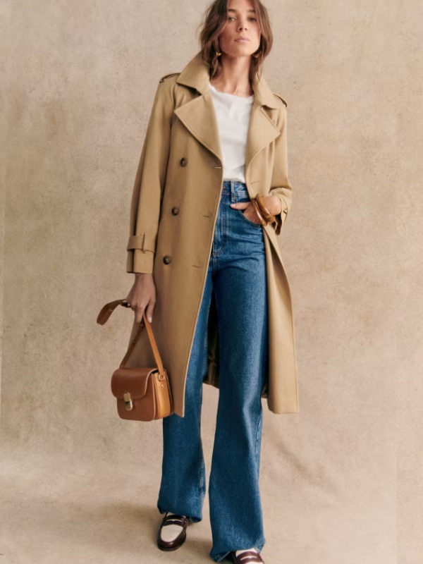A blue trench coat with a structure that is belted at the waist to create a fiercely fashionable shape. The little trace of a light denim collar peeking out from under the coat points to a casual layering item. This timeless denim shirt gives the ensemble a little bit of laid-back cool. Wide-leg jeans provide a touch of nonchalance and mobility, making them the ideal combination of comfort and style.