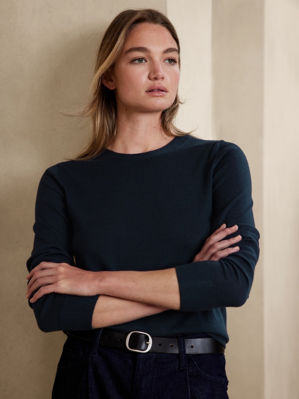 Who says comfort and elegance cannot live together in the office? This ensemble combines the carefree attitude of casual clothing with the polished, fitted appearance of work clothes.