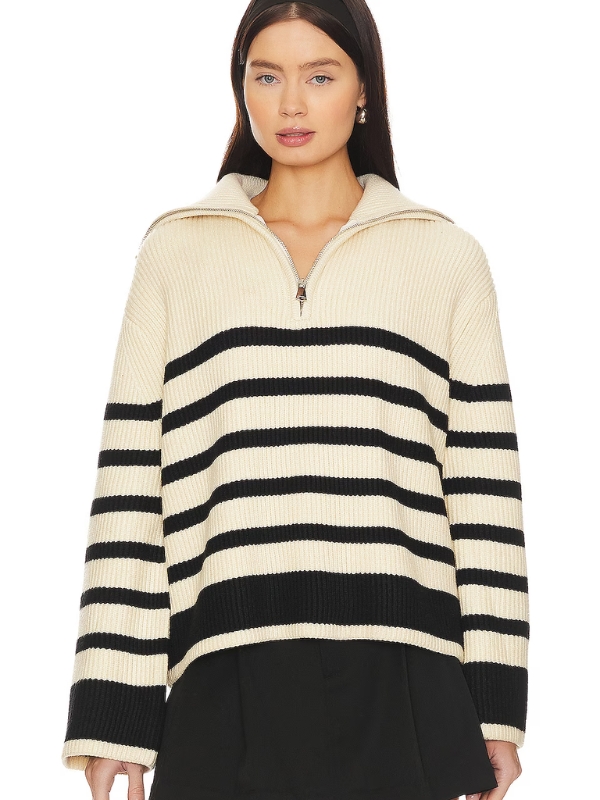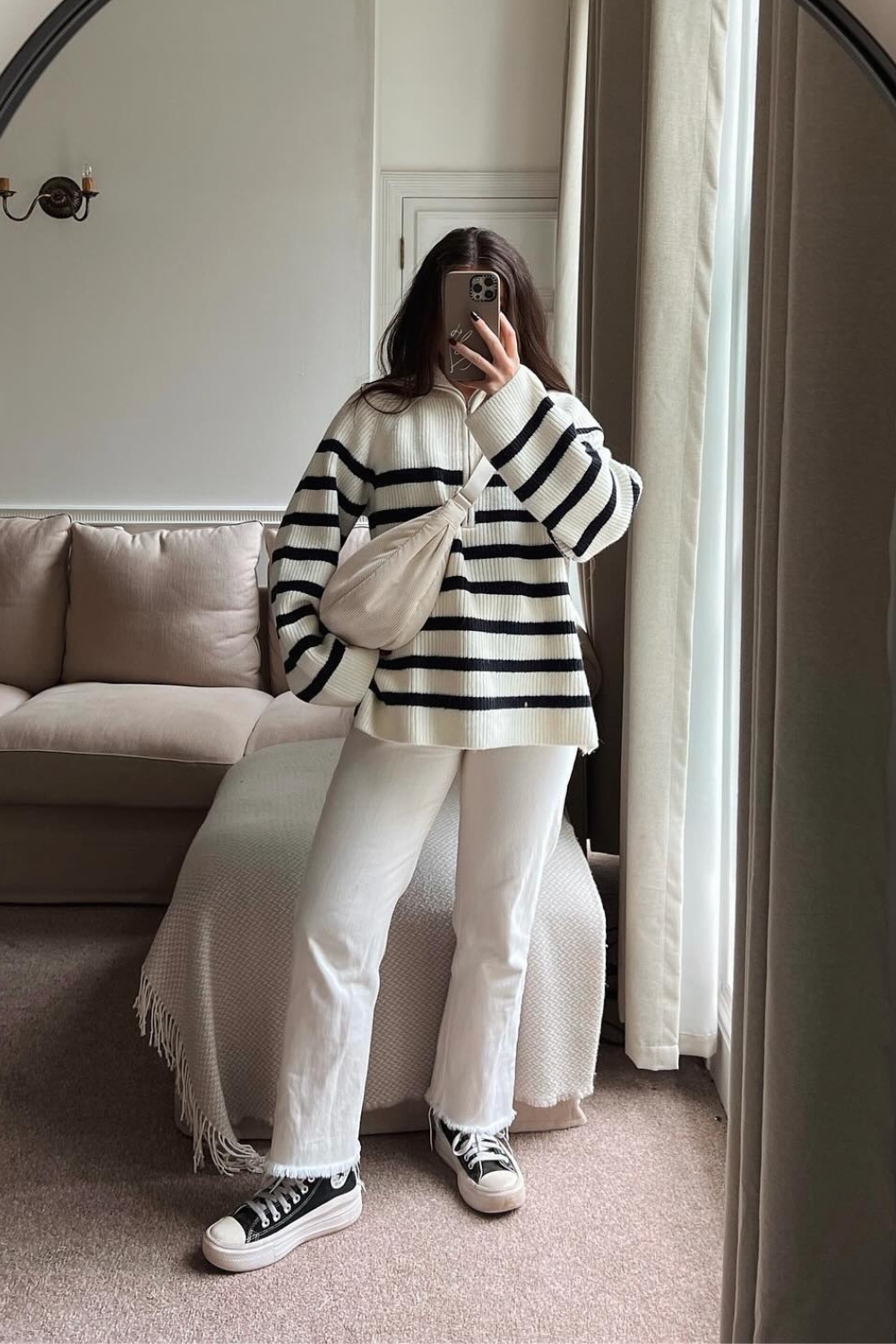 The core of the combination is the striped white and black turtleneck, which adds a classic touch. The way these timeless hues are paired conveys refinement and works with every season, so your style will always be on point.